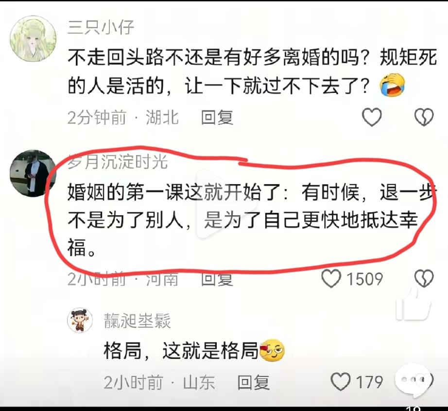 国庆节当天,山东某地,两队婚车碰头互不相让等了两个小时,俗话说婚车不能倒退,这局怎么解? 有网友在评论区给他们支招:其实只要,新人走过去,车再掉头没事,可破! 可问题又来了,双方谁做那个掉头的呢?这还不是回到了原来的难题。 有网友在评论区看似风轻云淡的表示:婚姻的第一课这不就开始了吗?有时候,退一步不是为了别人,是为了自己更快的抵达幸福。 说tmd谁都会说,那是事情没有临到你头上,换做是你,你愿意做那个掉头的吗?