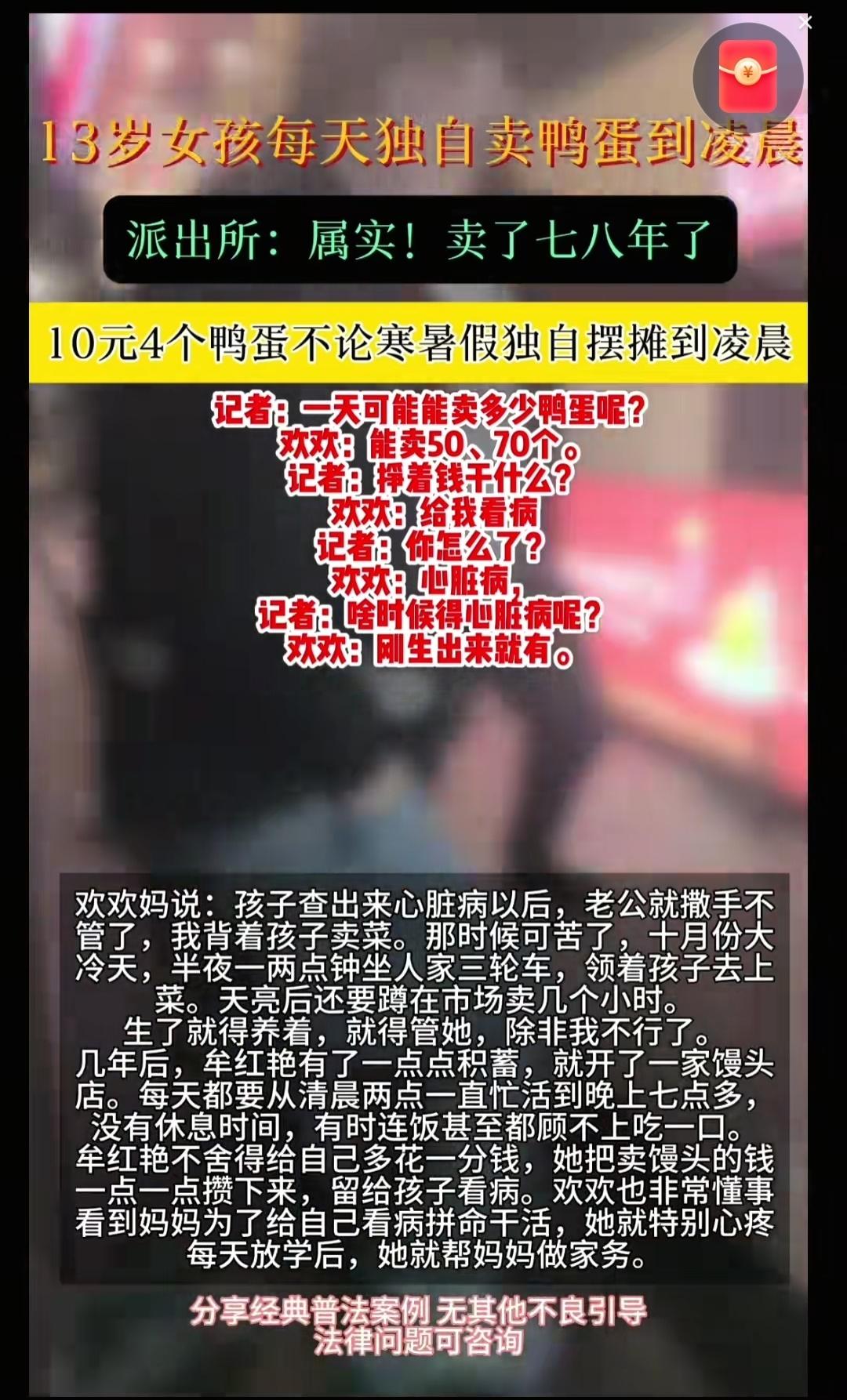 13岁女孩患先心病,独自卖鸭蛋筹医药费七八年… 鹤岗一名女孩欢欢,5岁开始卖鸭蛋,现已13岁。因患有先天性心脏病,从幼时起便在父母离异后,与母亲牟红艳相依为命。 为筹集自身看病费用,欢欢不论寒暑,每天放学后及假期里,都会独自在商铺台阶摆摊卖鸭蛋,常至凌晨才收摊,这一坚持就是七八年,鸭蛋按10元4个售卖,一天能卖出50到70个。 欢欢的母亲牟红艳为给孩子治病,曾背着她卖菜,大冷天半夜坐三轮车去上菜,天亮后还得在市场卖菜数小时;后来开馒头店,更是从清晨两点忙到晚上七点多,连饭都顾不上吃,把攒下的钱全留给孩子看病。 当地派出所已证实相关情况,欢欢的懂事与母女俩的坚韧处境引发关注。