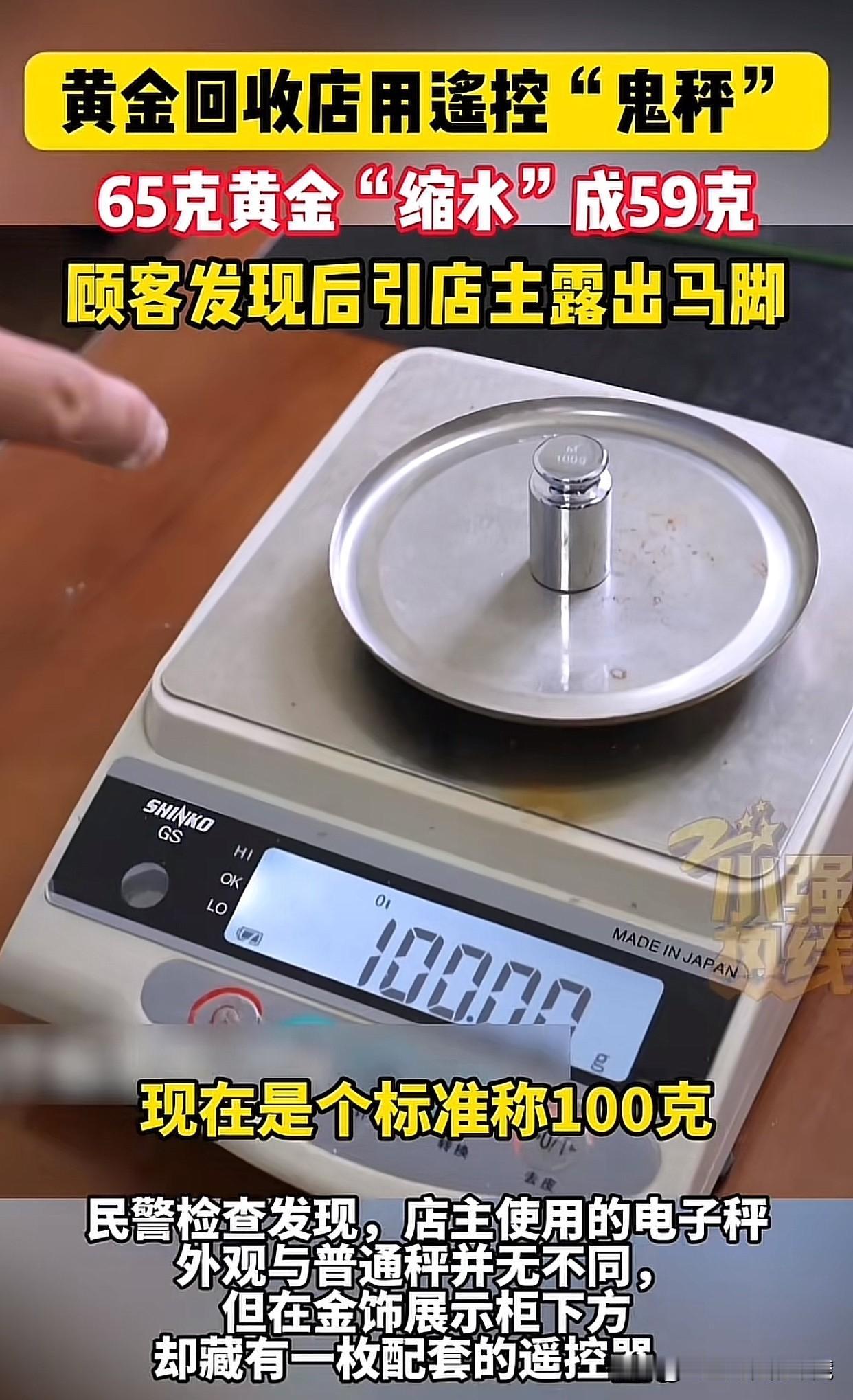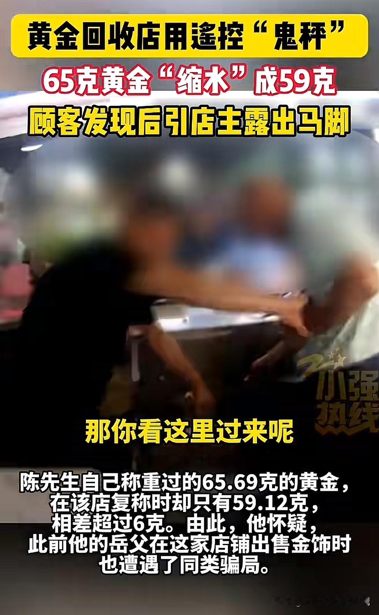 “细思极恐啊!”浙江慈溪有位大哥看金价涨了,就赶紧把攒的65克黄金拿去卖。谁知道到金店一称,居然只有59克,直接少了6克!大哥觉得不对劲,马上报警,结果发现店里用的秤果然动了手脚。 说实话,这种坑人的秤在黄金回收这行还真不少见。有些店家还会找理由,比如说你金子纯度不够,或者说磨损太厉害,趁机压价。 要我说,咱们卖金子的时候得注意两点:一是找那些靠谱的老店,二是从称重到检测全程都得盯着,别让他们有机会玩花样。 个人感觉,做生意最重要的就是诚信。也希望监管部门能好好管管这些乱象。大家卖金子时有没有遇到过类似情况?