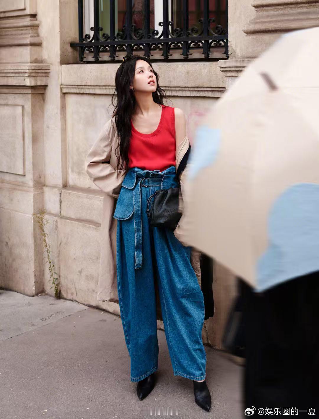 陈都灵巴黎街拍陈都灵在巴黎时装周首秀的LOEWE造型,牛仔与色彩的完美融合,让