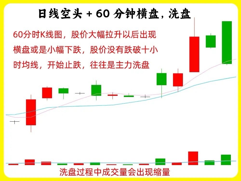 日K线中,股价处于上涨趋势当中,60分时K线图,股价大幅拉升以后出现横盘或是小幅下跌,股价没有跌破十小时均线,开始止跌,往往是主力洗盘。洗盘过程中成交量会出现缩量