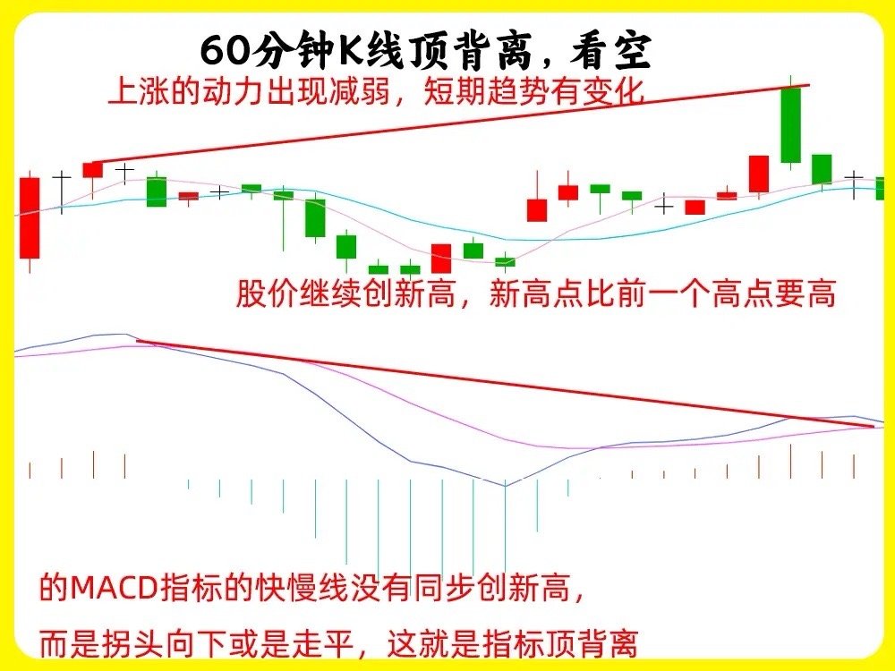 60分钟K线图中,股价继续创新高,新高点比前一个高点要高,而下方的MACD指标的快慢线没有同步创新高,而是拐头向下或是走平,这就是指标顶背离。说明上涨的动力出现减弱,短期趋势有变化