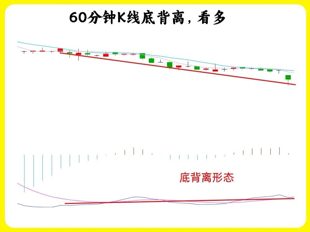 股价应该下跌以后,在60分钟K线图里,出现股价继续创出现新低,一个低比一个低要低,而MACD的快慢线或是红绿柱出现,上升,并没有出现同步下跌,这是底背离形态
