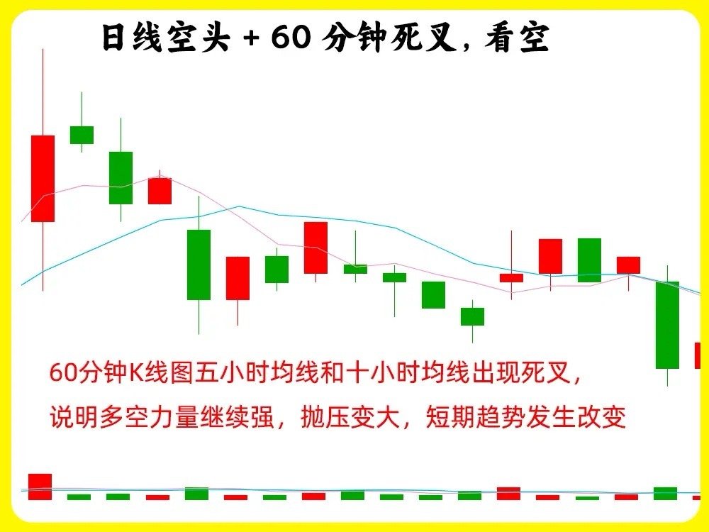 日K线图中,股价处于下跌趋势,多条均线向下发散,此时60分钟K线图五小时均线和十小时均线出现死叉,说明多空力量继续强,抛压变大,短期趋势发生改变