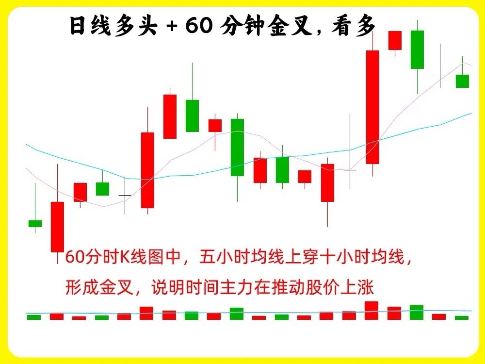 日K线图中,股价处于上涨趋势当中,多条均线斜率向上。60分时K线图中,五小时均线上穿十小时均线,形成金叉,说明时间主力在推动股价上涨。如果此时大周期处于下跌趋势当中,出现金叉,往往是短期反弹,意义不大