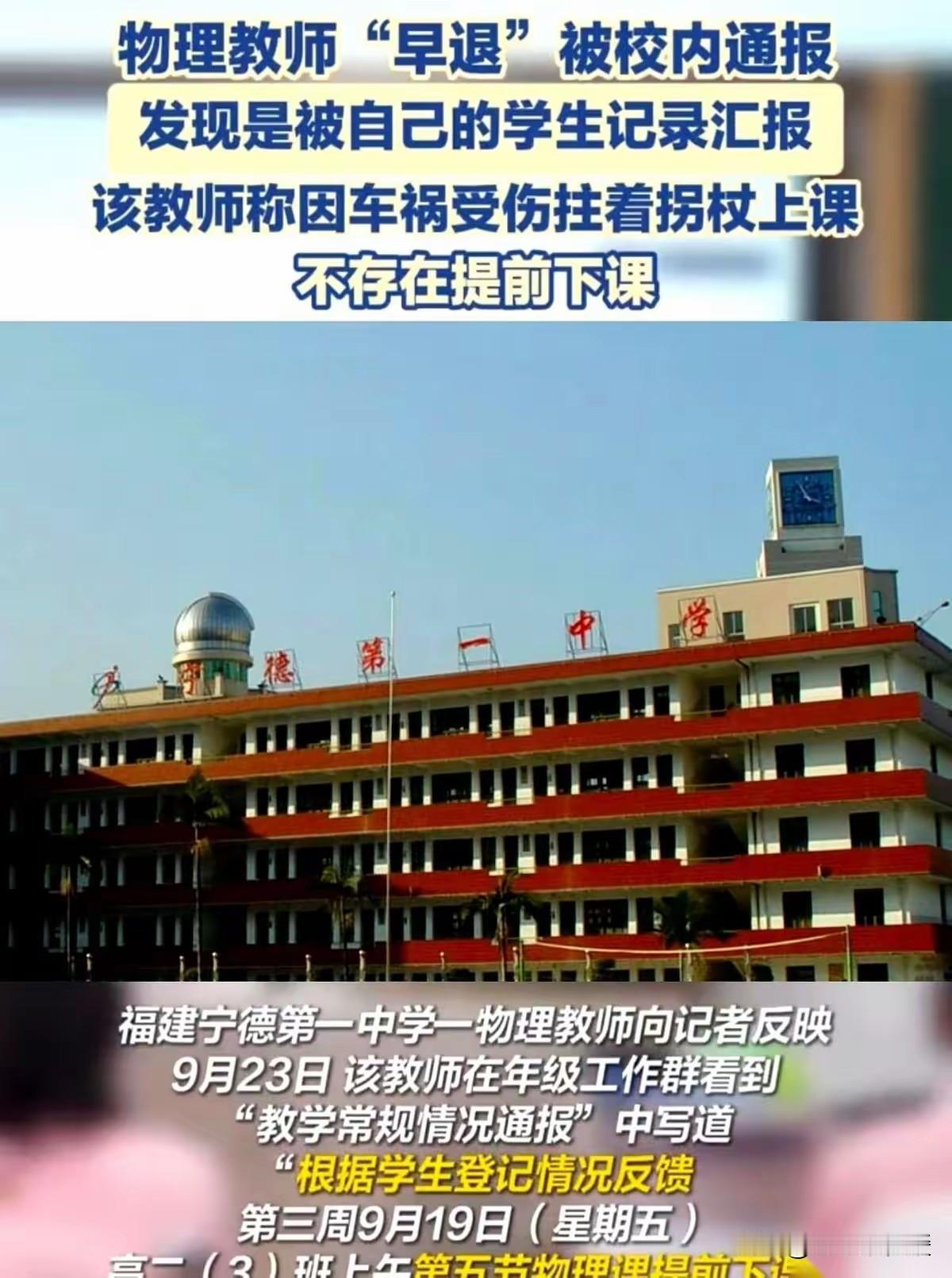 太寒心了🥀🥀🥀看到福建那位拄着拐杖坚持上课的物理老师被学生举报“早退”,最后还被学校通报,我心里咯噔一下🤯。这老师刚遭遇车祸,腿脚不便,却撑着讲台不肯落下课程,换来的竟是一纸冰冷的通报?更讽刺的是,举报他的正是自己用心教导的学生。 学校明明有监控,却连查都不查,只听学生一面之词。摄像头本是为保障公平,如今却成了“紧箍咒”,只束老师,不护真心。若总纵容此类轻率举报,让老师战战兢兢、不敢管不敢教,最终埋单的会是我们的孩子,和整个教育的未来。 💔 别让热心教师流汗又流泪 身体上的伤能养好,可心里的凉,难捂热啊! 希望每份坚持都不被辜负,每份严格都不被误解—— 教育需要温度,也需要底线和清醒。