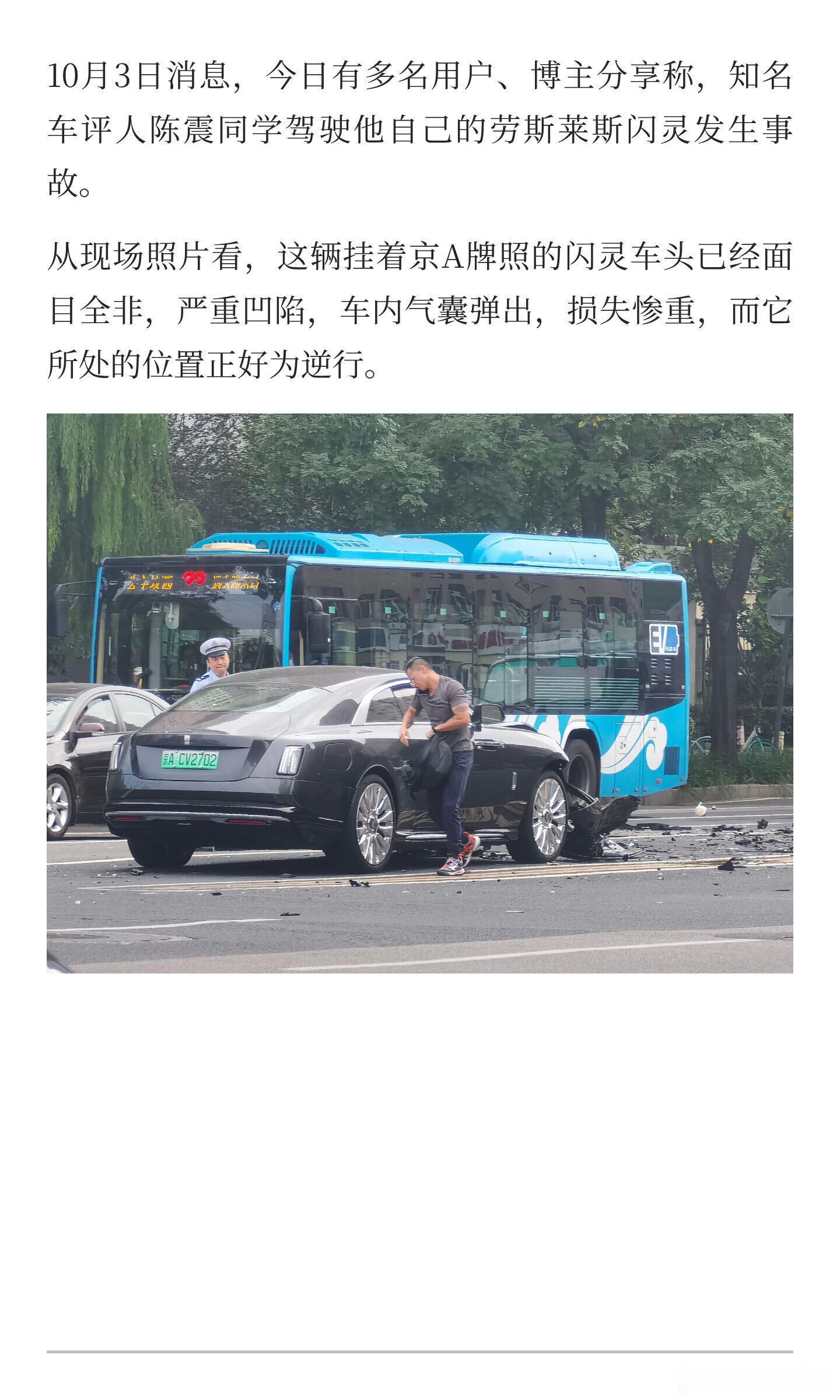 10月3日消息,今日有多名用户、博主分享称,知名车评人陈震同学驾驶他自己的劳斯莱斯闪灵发生事故。