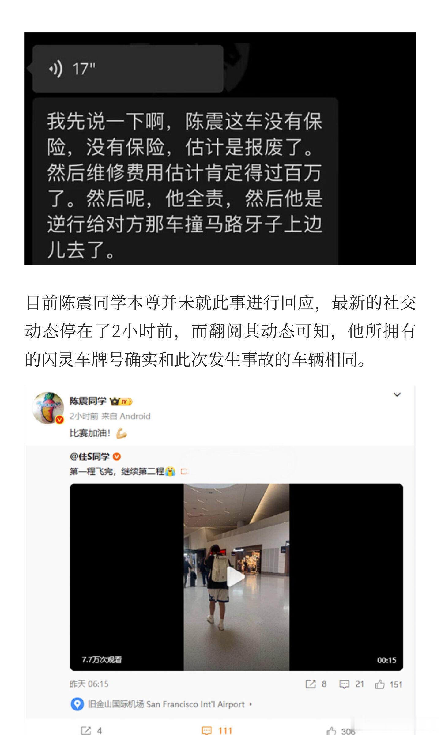 目前陈震同学本尊并未就此事进行回应,最新的社交平台动态停在了3小时前,而翻阅其动态可知,他所拥有的闪灵车牌号确实和此次发生事故的车辆相同。