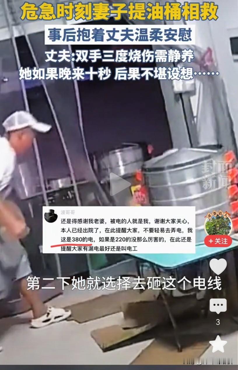 “再晚10秒,后果不堪设想!”丈夫触电,妻子提油相救,事后妻子紧紧把丈夫搂入怀中,这老婆娶对了! 最新后续来了,这位妻子回应当天的惊险一幕。 虽然媒体报道的时间是10月2日,但事件却是发生在9月25日。 夫妻俩经营着一家早餐店,别人还在睡觉的时候,他们凌晨4点多就起床干活,男子是4:48分去检查线路的时候被电到了,4:55分妻子把电给断了。 视频记录下了当时惊险的一幕(图一),男子被电了之后,赶紧站了起来,大喊“赶快断电”,用男子的话说,当时先是麻,后来是疼,还有点喘不上气(图四)。 在后厨忙碌的妻子,听到丈夫的叫喊声,赶紧前去查看,没有过多的考虑,拎起桌子下面的油桶,先是往男子手臂上砸了一下,那一次没有成功。 随后,妻子又拿起油桶往漏电的电线上砸,这一下成功了,却因为重力的惯性,妻子直接摔倒在地。 后来妻子前来查看丈夫的伤势,还在一边耐心地安慰他(图二),这样的场景看了让人暖心…… 有这样的妻子,夫复何求呢。 后来,来了一位懂电工的客人,他帮忙检查了线路,这才发现问题出在了电线上,并把坏的电线给包扎起来了。 这个丈夫也很不容易,把早上准备好的餐点都卖完了,这才和妻子一起去的医院,两个大拇指被包扎起来了,看起来还是蛮严重的。 这起事件虽然没有造成多大影响,却让我们看到这三点: 首先,安全用电,人人有责,特别是一些已经破坏或者老化的电线应该及时更换,以免发生不必要的麻烦。 第二,安装触电保护器的重要性,如果他们店面安装了,至少可以第一时间跳闸断电,男子也不会受伤这么严重。 第三,男子娶到了一个好老婆,面对丈夫触电冷静和果断,一点不拖泥带水,另外就是安慰丈夫的场景,实属很难得,让人感动。 大家觉得这妻子怎么样?