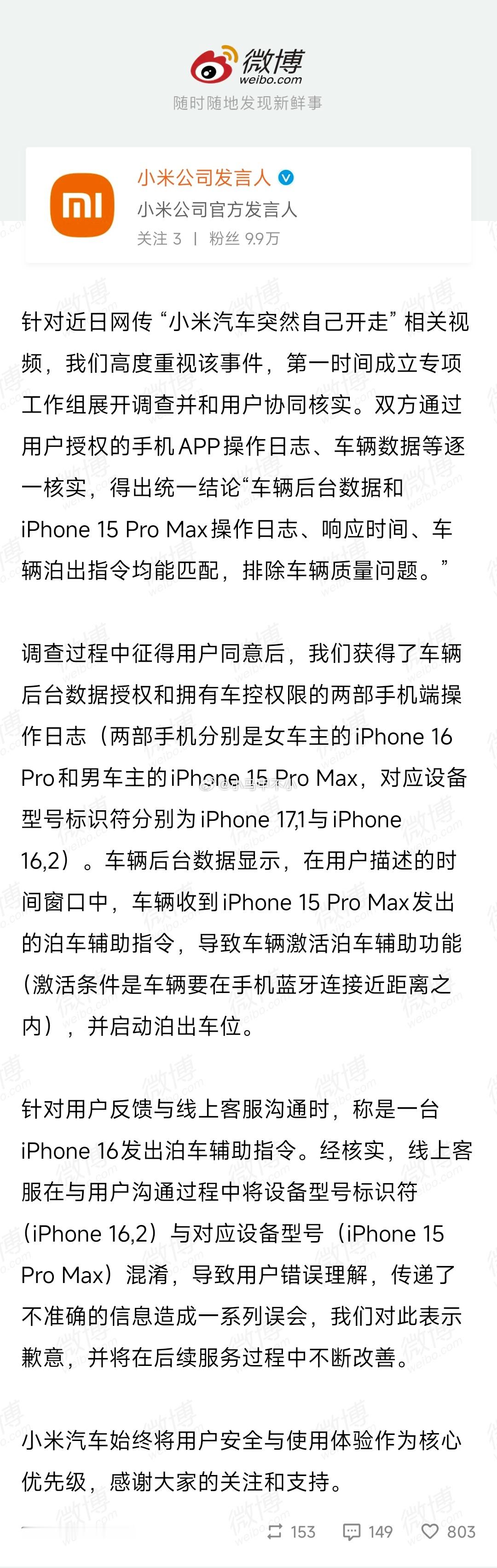 “车辆后台数据和iPhone 15 Pro Max操作日志、响应时间、车辆泊出指令均能匹配,排除车辆质量问题。”