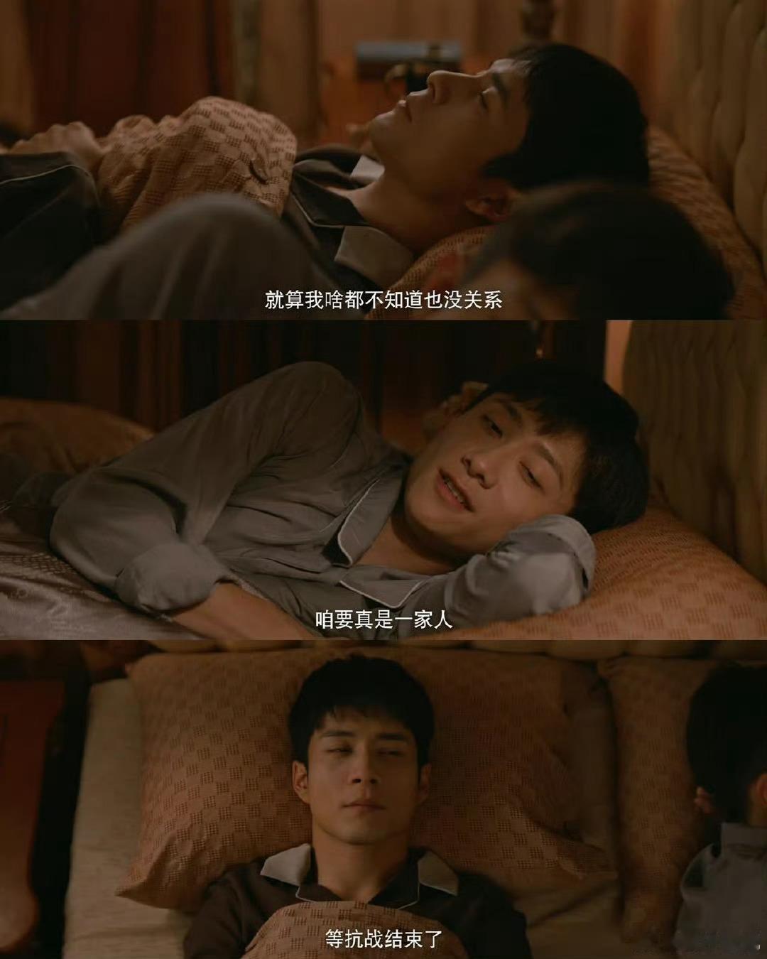 张一山咱们四个把日子过好 张一山一句“咱们四个把日子过好”,把谍战背景下的兄弟情演活了。他眼里的炙热藏着对安稳的渴望,却因乱世只能把真心藏在家常里;韩东君的隐忍与转身睁眼的细节,更是道尽“想并肩却只能推远”的无奈,两人演技张力拉满,这一段必须N刷!
