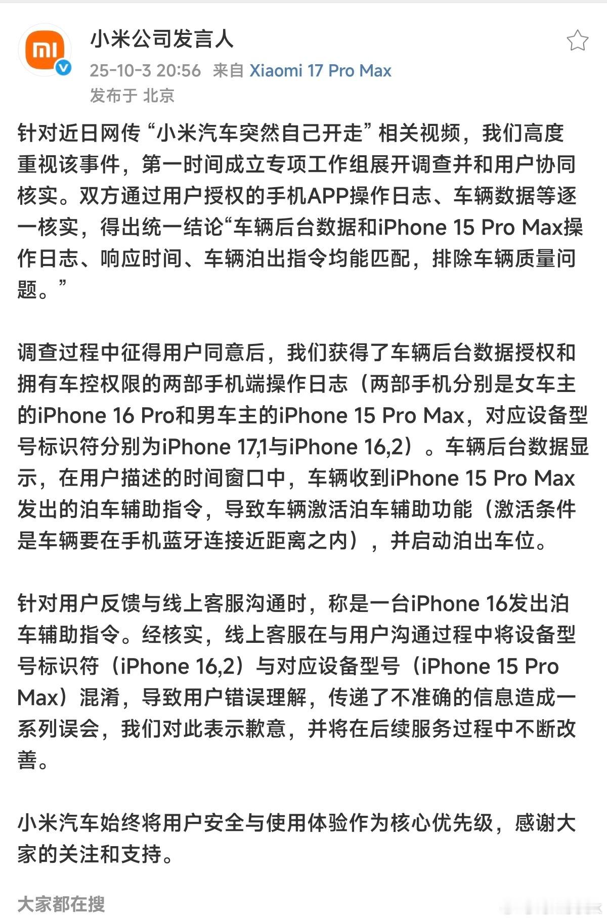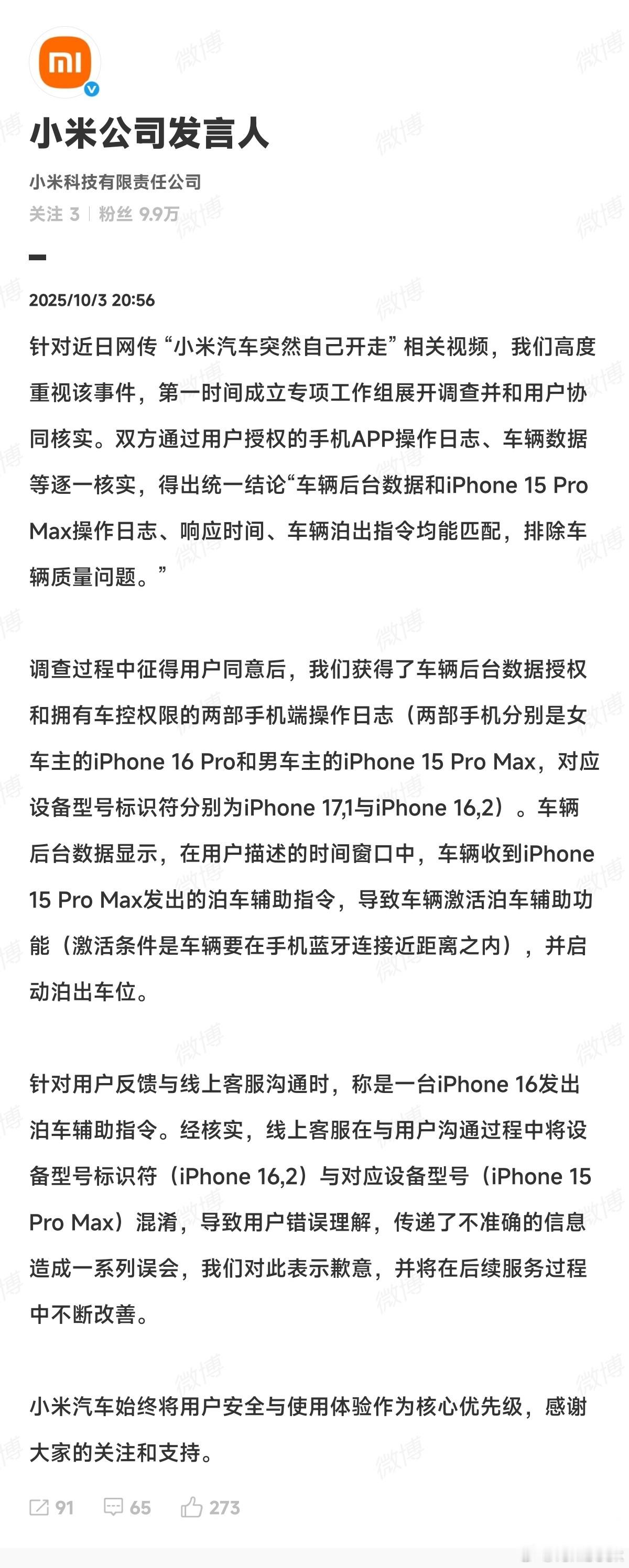 官方回应小米汽车突然自己开走了官方回应,总结:并非质量问题,而是南车主主动发出泊