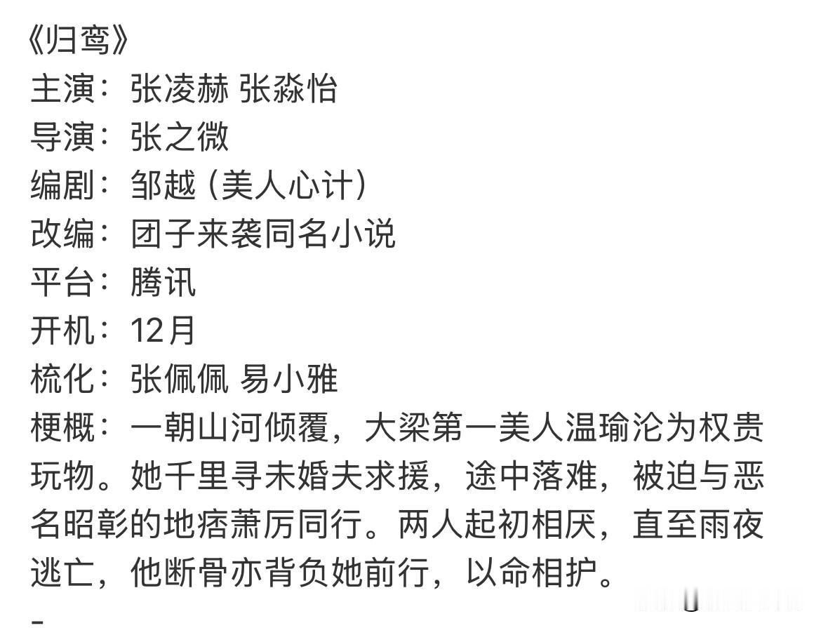 10月3日,张凌赫张淼怡首搭合作《归鸾》! 这几年,张凌赫合作的女演员年纪是越来越小,他也终于从二番爬上了一番男主的位置,这部剧类似于《逐玉》,值得一提的是这部剧的编辑是《美人心计》的编辑,所以对于剧情人物这块还是可以更加期待一下! 张凌赫是跟白鹿合作后,才在内娱崭露头角,又因跟白鹿恋情获得一大波流量,之后就主演戏约不断,做了多年二番,也算是熬出头了,张凌赫目前同样缺少一部一番实绩,如果这部剧播的好,他才算是上桌了!