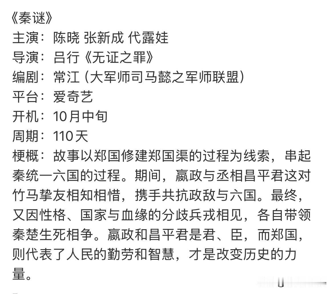 10月3日,陈晓,张新成合作双男主剧《秦谜》,不是爱情像,是兄弟情,女主代露娃! 感觉这几年张新成一直在拍双男主剧,之前跟丁禹兮合作的剧,还有不少人磕他俩,之前觉得张新成挺佛系的,后面看他拍电影的样子,以及他这两年接住的模式,发现他有一颗想要火,想要更上一层楼的心! 这很正常,娱乐圈谁都想火,谁都想做顶流当一线,只是之前感觉张新成偏学院派,不走流量路线,以为他不在乎这些,如今看来也不是,张新成有演技有实力,缺两部爆剧!