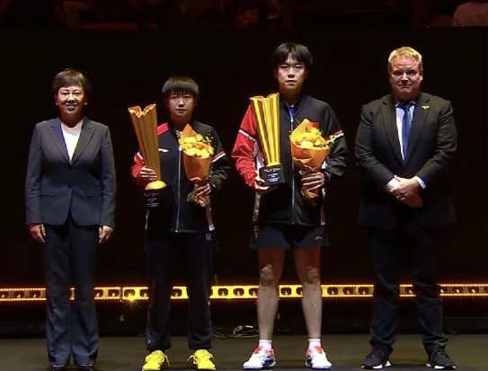 混双冠军的合照来了! 这次的奖杯真好看,金灿灿的,还有捧花!! 楚钦也是好起来了,居然掌镜拍合照了,第一次看到他拿手机拍照! 莎莎笑得真好看! 好开心的两个孩子! 两小只站在一起真养眼! 再次恭喜孙颖莎王楚钦夺冠!