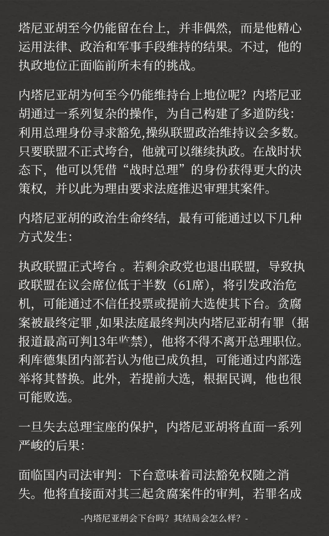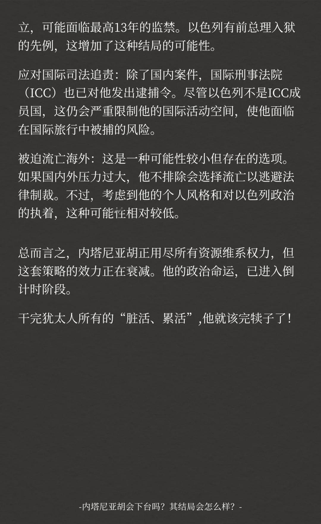 内塔尼亚胡会下台吗?其结局会怎么样? 内塔尼亚胡是一位极具争议且对以色列乃至中东政局有着深远影响的政治人物。他是以色列政坛的不倒翁、强硬右翼代表人物、累计任期最长的总理。曾经是 特种部队老兵、美国麻省理工学院学霸、前驻美外交官。对巴勒斯坦问题和伊核问题态度强硬,精于政治算计,善于组建联盟。当前困境面临国内腐败指控、国际社会批评与孤立,以及因处理加沙冲突而导致的国内民意分裂。塔尼亚胡至今仍能留在台上,并非偶然,而是他精心运用法律、政治和军事手段维持的结果。不过,他的执政地位正面临前所未有的挑战。内塔尼亚胡为何至今仍能维持台上地位呢?内塔尼亚胡通过一系列复杂的操作,为自己构建了多道防线:利用总理身份寻求豁免,操纵联盟政治维持议会多数。只要联盟不正式垮台,他就可以继续执政。在战时状态下,他可以凭借“战时总理”的身份获得更大的决策权,并以此为理由要求法庭推迟审理其案件。内塔尼亚胡的政治生命终结,最有可能通过以下几种方式发生:执政联盟正式垮台 。若剩余政党也退出联盟,导致执政联盟在议会席位低于半数(61席),将引发政治危机,可能通过不信任投票或提前大选使其下台。贪腐案被最终定罪 ,如果法庭最终判决内塔尼亚胡有罪(据报道最高可判13年监禁),他将不得不离开总理职位。利库德集团内部若认为他已成负担,可能通过内部选举将其替换。此外,若提前大选,根据民调,他也很可能败选。一旦失去总理宝座的保护,内塔尼亚胡将直面一系列严峻的后果:面临国内司法审判:下台意味着司法豁免权随之消失。他将直接面对其三起贪腐案件的审判,若罪名成立,可能面临最高13年的监禁。以色列有前总理入狱的先例,这增加了这种结局的可能性。应对国际司法追责:除了国内案件,国际刑事法院(ICC)也已对他发出逮捕令。尽管以色列不是ICC成员国,这仍会严重限制他的国际活动空间,使他面临在国际旅行中被捕的风险。被迫流亡海外:这是一种可能性较小但存在的选项。如果国内外压力过大,他不排除会选择流亡以逃避法律制裁。不过,考虑到他的个人风格和对以色列政治的执着,这种可能性相对较低。总而言之,内塔尼亚胡正用尽所有资源维系权力,但这套策略的效力正在衰减。他的政治命运,已进入倒计时阶段。干完犹太人所有的“脏活、累活”,他就该完犊子了!