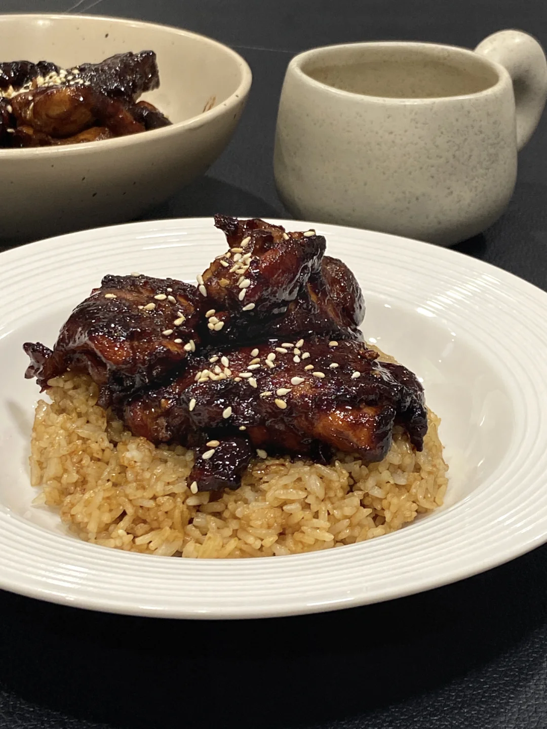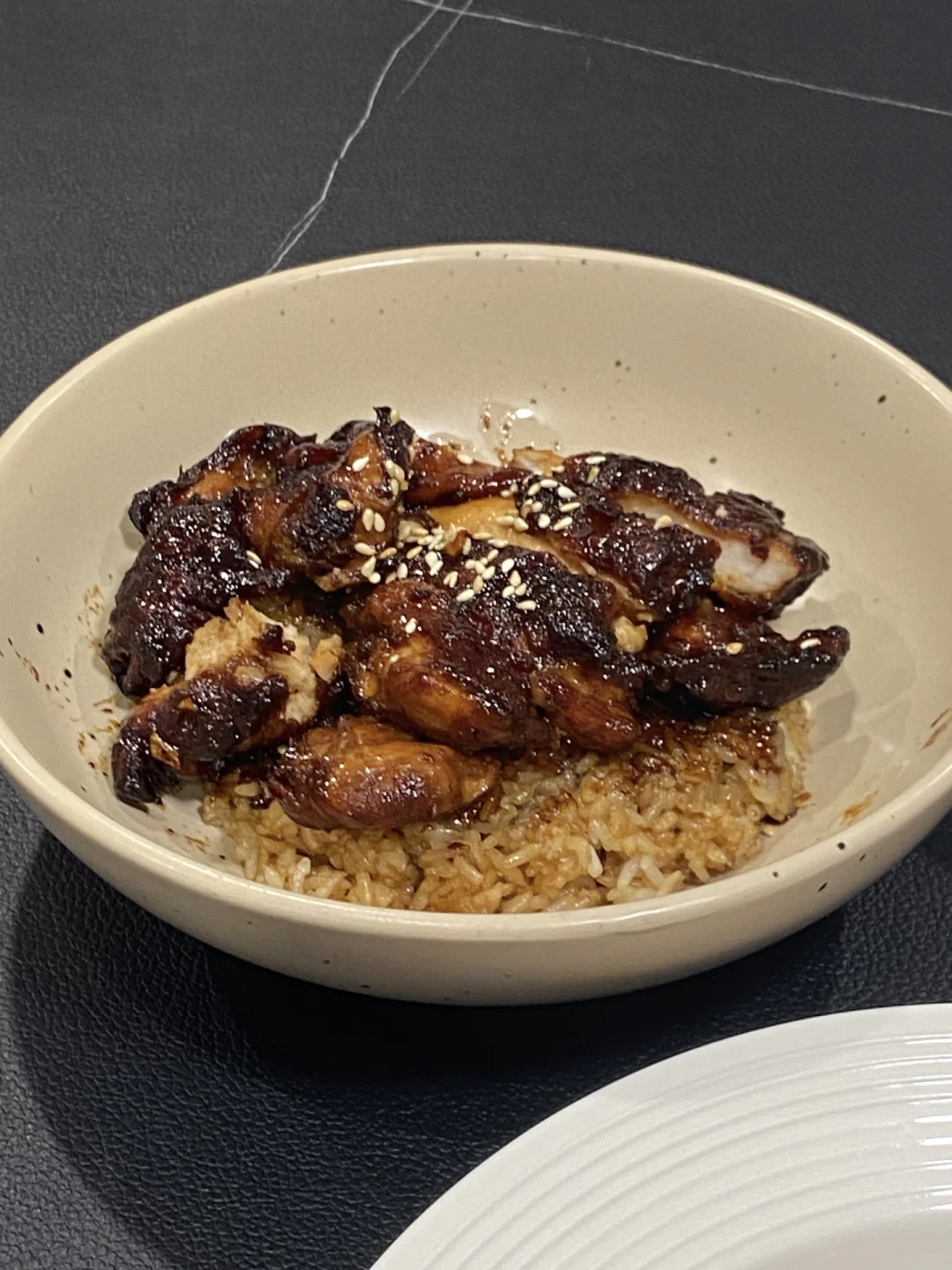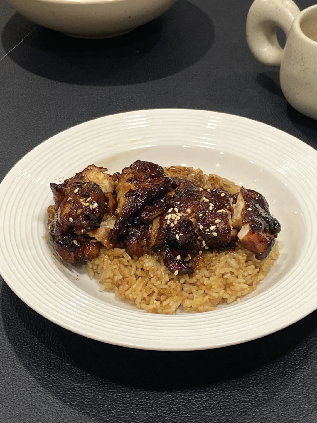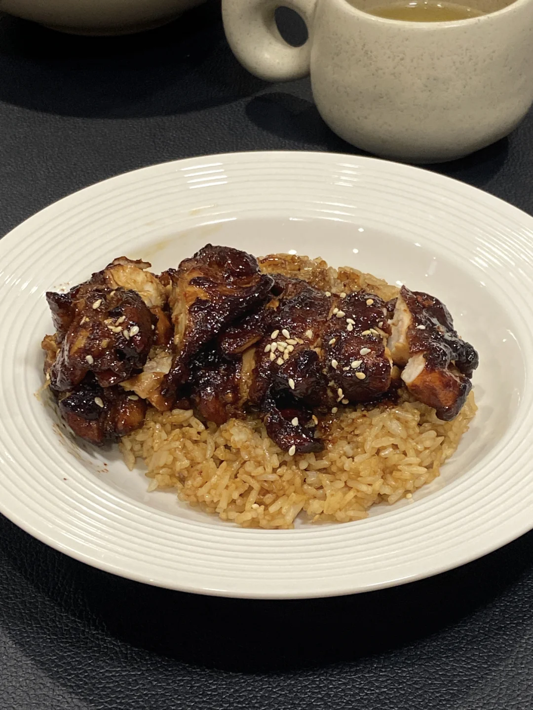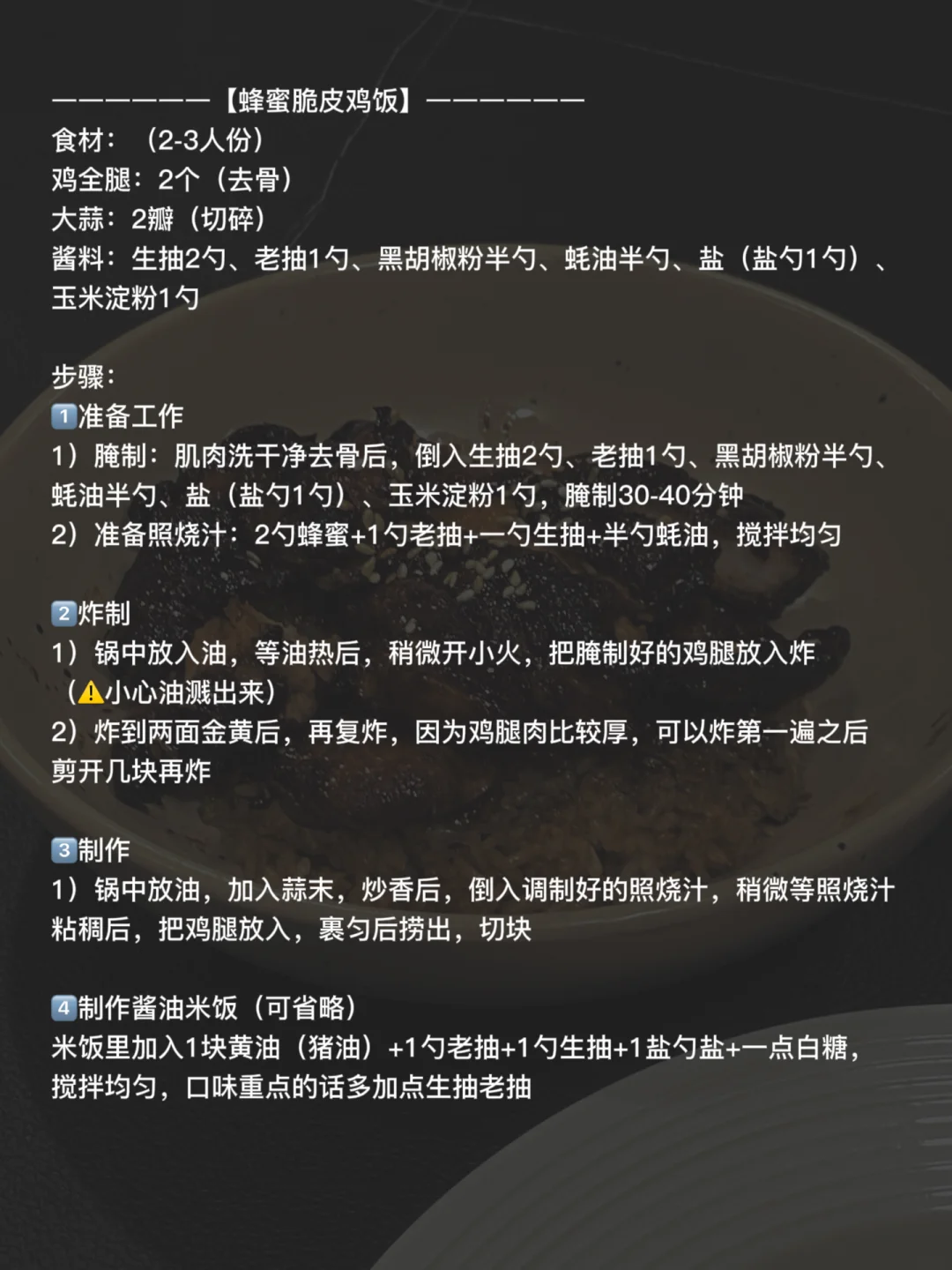 菜谱在p5 蜂蜜脆皮鸡配上酱油拌饭好香啊! 原材料也超级简单,只需要鸡腿肉,这个炸出来是酥脆皮的状态,裹上酱汁之后很好吃! 要注意的就是炸的时候注意油锅⚠️