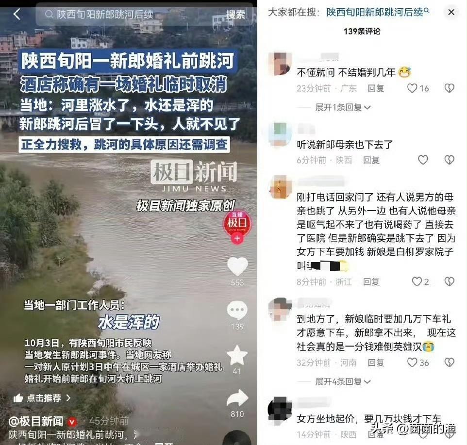 新郎在婚礼前突然跳河,人没了。网上传疯了,说女方临时加价要下车礼,不给钱不下车,