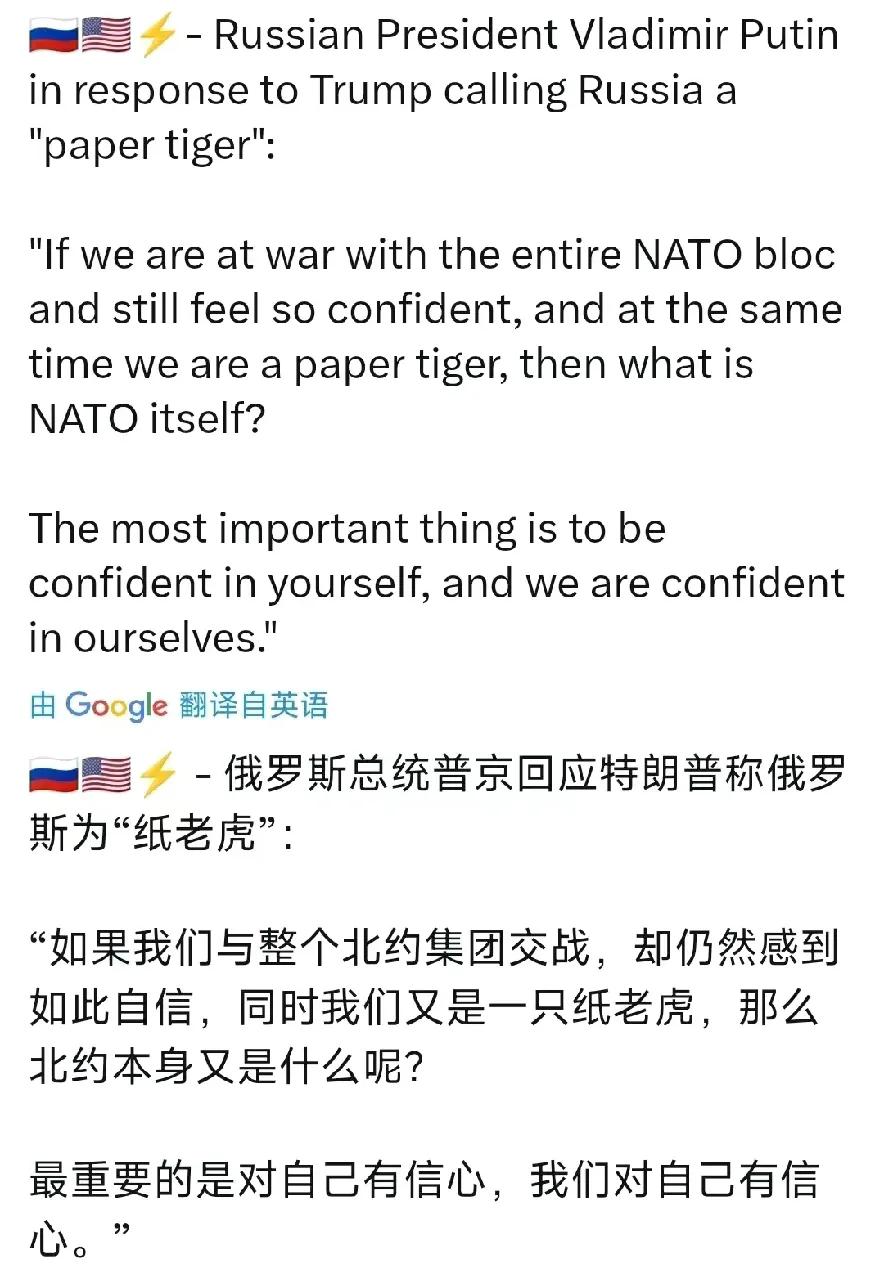 普京回应特朗普称俄罗斯为“纸老虎”:“如果我们与整个北约集团交战,却仍然感到如此自信,同时我们又是一只纸老虎,那么北约本身又是什么呢?最重要的是对自己有信心,我们对自己有信心。” 普京就是普京,这样一比北约是什么?美国又是什么?普京又高特朗普一筹!特朗普就是随心所欲,胡咧咧,说了又改,改了再说。还没等普京吱声呢,说俄罗斯是“纸老虎”只隔一天他就改了,称再不说别人是“纸老虎”了,就是因为俄总统新闻秘书佩斯科夫说,俄罗斯是真正的熊! 普京大帝