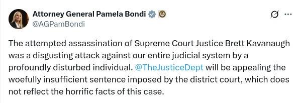 🚨🇺🇸美国司法部将对卡瓦诺刺杀未遂案“量刑不足”提出上诉 司法部长帕姆·邦迪宣布,司法部将对尼古拉斯·罗斯克的判决提出上诉,罗斯克于2022年6月试图暗杀最高法院大法官布雷特·卡瓦诺。 司法部长帕姆·邦迪(Pam Bondi): “对最高法院大法官布雷特·卡瓦诺的暗杀企图是一个精神极度失常的人对我们整个司法系统的令人厌恶的攻击。 司法部将对地区法院判处的严重不足的刑罚提出上诉,该刑罚并未反映此案的可怕事实。” 当时26岁的罗斯克从加利福尼亚州前往卡瓦诺位于马里兰州的家,携带一把格洛克手枪、战术刀、扎带、胡椒喷雾、胶带和盗窃工具。 他计划因堕胎权和枪支管制而杀死卡瓦诺。 他在实施袭击之前亲自拨打了911,并在法官家外被捕。 地方法院仅判处罗斯克8年监禁。 鉴于他差点刺杀现任最高法院法官,检察官建议判处至少30年监禁。 司法部目前正在上诉,要求判决能够反映谋杀最高法院成员未遂罪的严重性。 资料来源:@AGPamBondi,华盛顿邮报 🚨🇺🇸 DOJ TO APPEAL "INSUFFICIENT" SENTENCE IN KAVANAUGH ASSASSINATION ATTEMPT Attorney General Pam Bondi announced the Justice Department will appeal the sentence given to Nicholas Roske, who attempted to assassinate Supreme Court Justice Brett Kavanaugh in June 2022. Pam Bondi, Attorney General: "The attempted assassination of Supreme Court Justice Brett Kavanaugh was a disgusting attack against our entire judicial system by a profoundly disturbed individual. DOJ will be appealing the woefully insufficient sentence imposed by the district court, which does not reflect the horrific facts of this case." Roske, then 26, traveled from California to Kavanaugh's Maryland home armed with a Glock pistol, tactical knife, zip ties, pepper spray, duct tape, and burglary tools. He planned to kill Kavanaugh over abortion rights and gun control. He called 911 on himself before carrying out the attack and was arrested outside the justice's home. The district court sentenced Roske to just 8 years in prison. Prosecutors had recommended at least 30 years given he came within feet of assassinating a sitting Supreme Court justice. DOJ is now appealing to secure a sentence that reflects the severity of attempting to murder a member of the nation's highest court. Source: @AGPamBondi, WaPo
