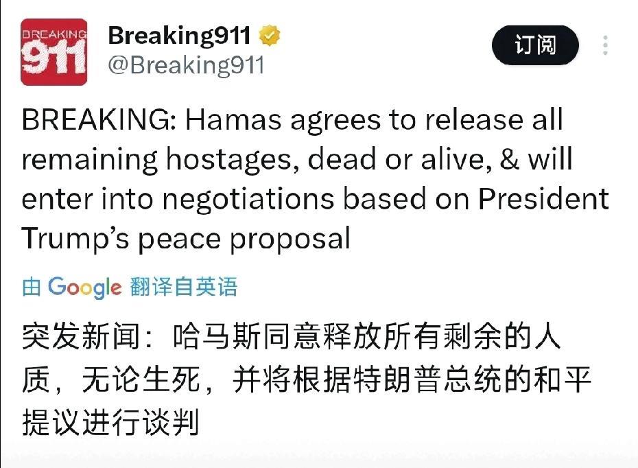 大反转!我相信哈马斯,以色列必须停止对加沙轰炸,川普最新表态,让人眼前一亮 一觉醒来,加沙又出现新的状况,据外媒突发新闻显示,哈马斯同意放人,无论生死,一个不留。 随即,川普表示,他相信哈马斯已准备好持久和平,要求以色列必须停止对加沙的轰炸。 这两个信息交织,让人眼前一亮。 为什么这么说呢? 首先,川普开始相信哈马斯,这是一个大反转,这个明显的变化,在以前是难想象。 其次,看似要求,更像是在求以色列停火。只是内塔尼亚胡会听吗? 我看难,当他连“环保少女”的“全球坚韧船队”也袭击的时候,他还停的下来吗? 我看难!只要停止,国际刑事法院的审判,以国内的清算都会开始,拿不到自身利益保证的前提下,他不会收手。