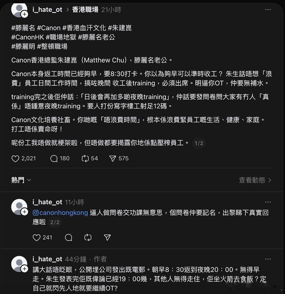 該網民續說:「training完之後佢仲話:『日後會再加多啲夜晚training』,仲話要發問卷問大家有冇人『真係』唔鍾意夜晚training。要人打份寫字樓工射足12碼。」文末,網民更直斥:「Canon文化培養社畜。你哋嘅『唔浪費時間』,根本係浪費緊員工嘅生活、健康、家庭。打工唔係賣命呀!」