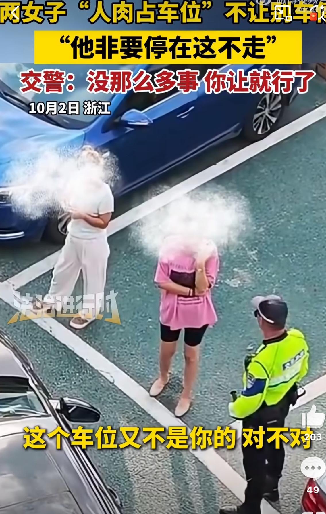 您说这事儿气人不?就在浙江一商场停车场,两位大姐硬是用身子霸占着一个空车位,旁边有车想停进去,她们愣是拦着不让,嘴里还喊着:“别倒!我们家的车马上就到了!” 那司机也没辙,总不能真撞上去吧?只好僵在那儿。 好在民警很快来了,人家可没和稀泥,开口就点明了要害:“这是公共车位,是给车停的,不是让人站的!你们的车没到,就不能占着茅坑不那啥。” 看两位大姐还想争辩,民警又指了指后面堵住的车龙:“就因为你们俩,这么多车都过不去了。” 这话在理,两位大姐也没了脾气,最后在民警的劝说下不情不愿地让开了。这事儿被传到网上后,网友纷纷点赞,夸这是“教科书式执法”。 以前遇到这种“人肉占车位”的糊涂账,经常是各退一步,结果谁都不满意。这回民警态度明确,道理也讲得清楚:公共车位,谁车先到谁先停,这是规矩!而且人家执法有温度,先讲道理,给了台阶下,没让矛盾升级。 要我说啊,现在停车位这么紧张,公共车位就像大家排队等的位置,谁先开车到就算谁的。 要是人人都派个人提前去占着,那不就乱套了?浙江民警这次的处理,干脆利落,给所有人都上了一课:守规矩,才能大家都方便。