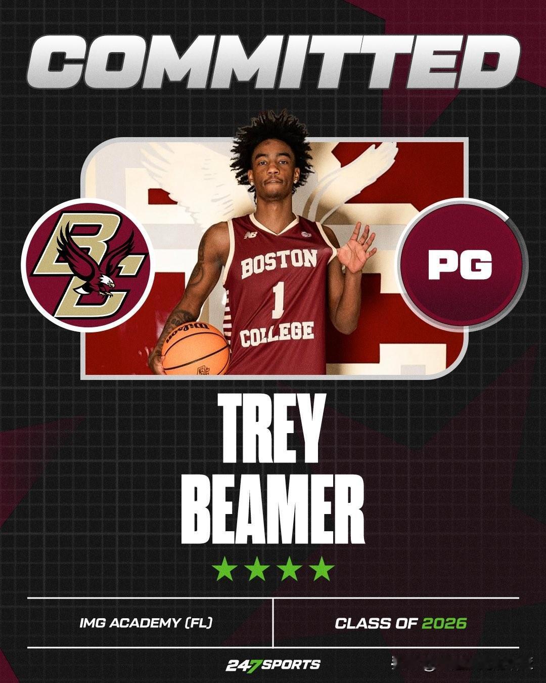 四星控卫Trey Beamer宣布承诺NCAA男篮 波士顿学院,高四赛季就读于佛罗里达州IMG学院,表示这是最适合我的地方,我是球队优先考虑的对象,作为一位新生,我可以立即参与进来并产生影响。从第一天起,我就能把球掌握在手中,负责进攻,他们让我在那里做我自己。