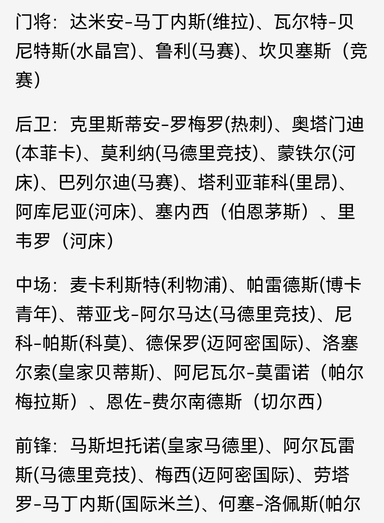阿根廷队:看完名单,心凉半截 如果说荷兰队是脚重头轻,那阿根廷队就是标准的头重脚轻了。 中前场就是目前的世界最佳。 中场麦卡+恩佐+德保罗,并不会比西班牙差。 前场梅西+小蜘蛛+小西蒙尼,也比英法高一个档次。 但一看后场,心凉半截。 都3年了,还是这几位不省心的主占据主力位置。 罗梅罗天坑,奥塔门迪明年38岁了,赶紧换巴列尔迪或赛内西试试看吧。 至于边后卫,更是惨不忍睹。莫利纳、塔利亚菲科、阿库尼亚、蒙铁尔,全都是四流边后卫。 再看看主要竞争对手,法国特奥+孔德,荷兰邓弗里斯+延伯,葡萄牙门德斯+达洛特,英格兰詹姆斯+斯凯利,都能碾压阿根廷。好在苦主德国、死敌巴西的边后卫也不是太强,遇上他们还不至于太吃亏。 所以,现在阿根廷也没什么更好的办法了,右路交给小西蒙尼,左路交给小蜘蛛,好在这2人都年轻,都算能攻能防,多少能帮上边后卫的忙。 只靠中路的阿根廷队,卫冕前景确实堪忧。