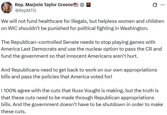 🇺🇸MTG:“我们不会为非法移民提供医疗资助” “我们不会为非法移民提供医疗保健资金,但依靠妇女、婴儿和婴儿食品附加计划(WIC) 的无助妇女和儿童不应该因为华盛顿的政治斗争而受到惩罚。 共和党控制的参议院需要停止与美国最后的民主党人玩游戏,并使用核选项通过 CR并为政府提供资金,以免无辜的美国人受到伤害。 共和党人需要重新开始制定我们自己的拨款法案并通过美国人民投票支持的政策!” 资料来源: @RepMTG 🇺🇸 MTG: “WE WILL NOT FUND HEALTHCARE FOR ILLEGALS” “We will not fund healthcare for illegals, but helpless women and children on WIC shouldn’t be punished for political fighting in Washington. The Republican-controlled Senate needs to stop playing games with America Last Democrats and use the nuclear option to pass the CR and fund the government so that innocent Americans aren’t hurt. And Republicans need to get back to work on our own appropriations bills and pass the policies that America voted for!” Source: @RepMTG