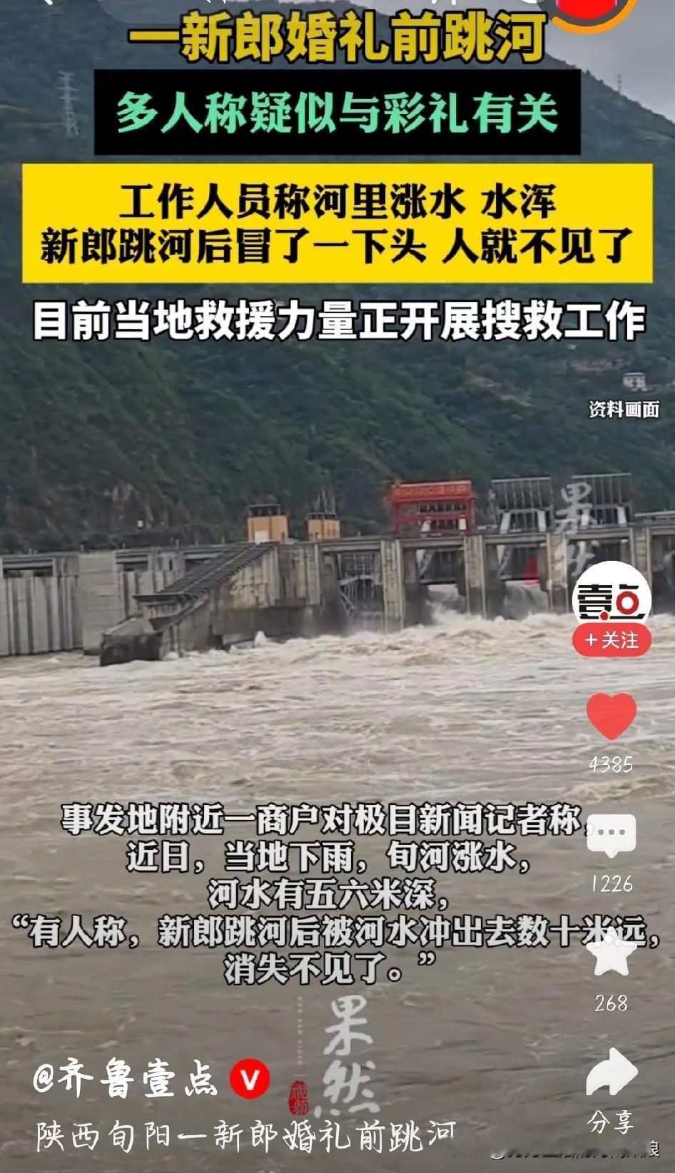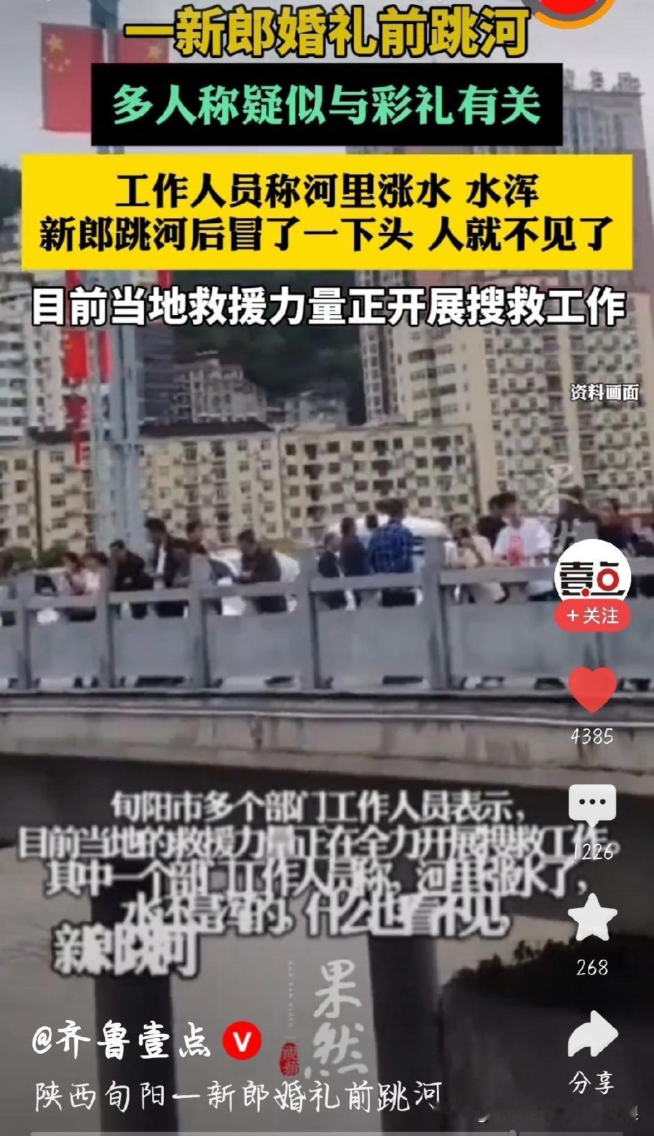 太揪心了!陕西安康29岁的新郎,婚礼当天直接从旬河大桥跳了下去,人到现在还没找到。 本来酒店都布置好了,宾客也到齐了,就等着开席。结果接亲时,女方临时要2万“下车费”,说不给就不下车。可男方之前已经给了20万彩礼,早就掏空了家底,实在拿不出钱了。 小伙子一时想不开,从酒店门口直奔大桥,纵身就跳了下去。当时河水涨得厉害,有五六米深,人一下就被冲出去几十米,再也没露头。 公安、消防都赶来了,可河水又浑又急,搜救太难了。好好的喜事变成这样,网友都炸了:“这哪是结婚,分明是逼命!” 真希望能有奇迹,也盼着这畸形的婚俗能醒醒!官方通报男子婚礼当天跳河 你认为一个人最可贵的品质是什么 桥头跳河
