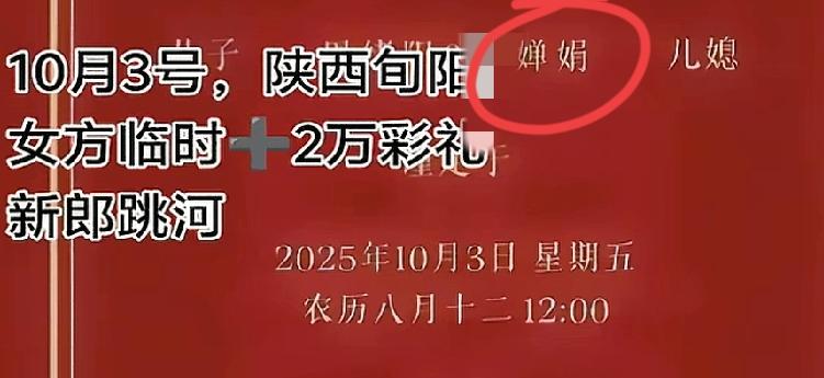 阳历10月3日,农历8月12,多好的日子啊!本来是旬阳周家儿子迎娶李家女儿的大喜日子,却因为加彩礼惹出祸事! 新郎小周人长得高大帅气,还是教师。新娘名字里有古代四美之一,但颜值一般。 据称彩礼28万,新娘下车时女方又要求加2万,小周苦劝无果,进退两难,一时想不开坠河了。 小周太冲动,太不爱惜自己,把自己父母可坑惨了,白发人送黑发人,婚日变祭日。 新娘小李和她父母也是拎不清,这么好的小伙子,工作也稳定,嫁过来好好过日子,以后要多少个2万没有啊! 就为了这点钱,人也没了,自己也出名了!得不偿失!