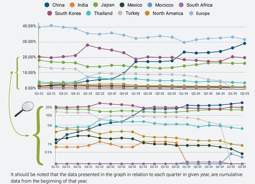 据以色列汽车进口协会数据显示,2025年前8个月中国品牌占据以国新能源车市场半壁江山,整体汽车市场份额从2021年的1%猛增至28.7%,成为该国市占率唯一持续增长的国家。其中奇瑞、比亚迪分列销量第三、四位,而在纯电领域,前十品牌中中国占据九席,仅特斯拉一家美国企业排名第五。最令人惊叹的是,今年6月一枚导弹残骸击中一辆小鹏G6竟未引发火灾,其电池安全技术在当地引发热议。以色列自2018年推行新能源政策,将电动车购置税降至10%(燃油车83%),尽管目前税率已升至45%,电动车占比仍逆势突破50%。当安全性与产品力成为硬通货,中国制造就能打破地缘政治壁垒。以色列汽车进口协会中国汽车出海