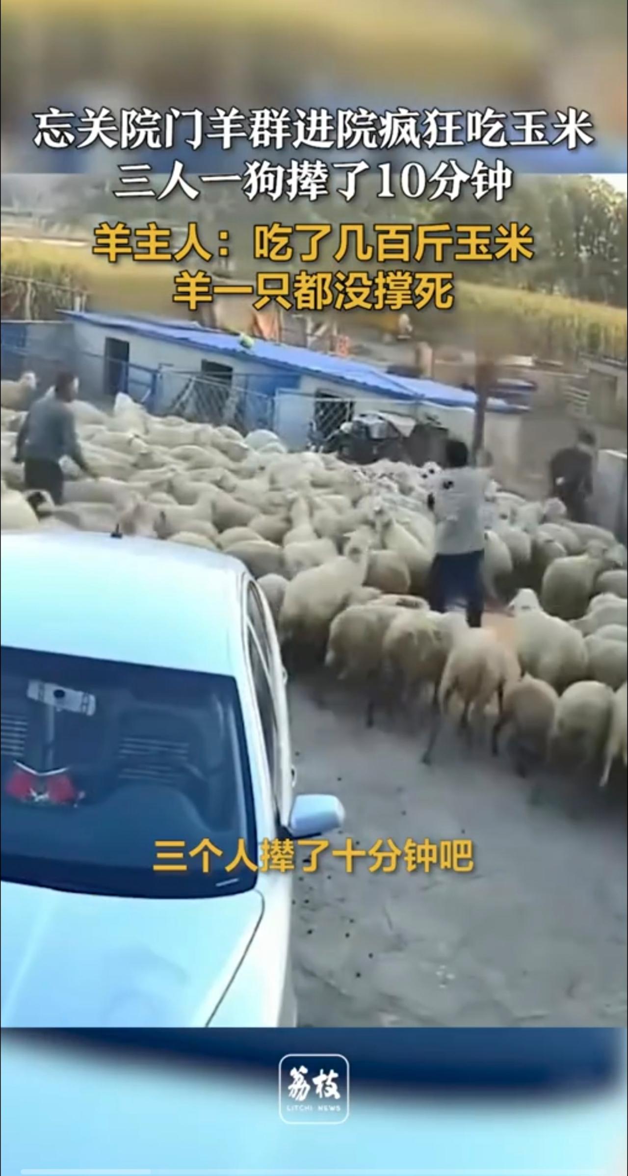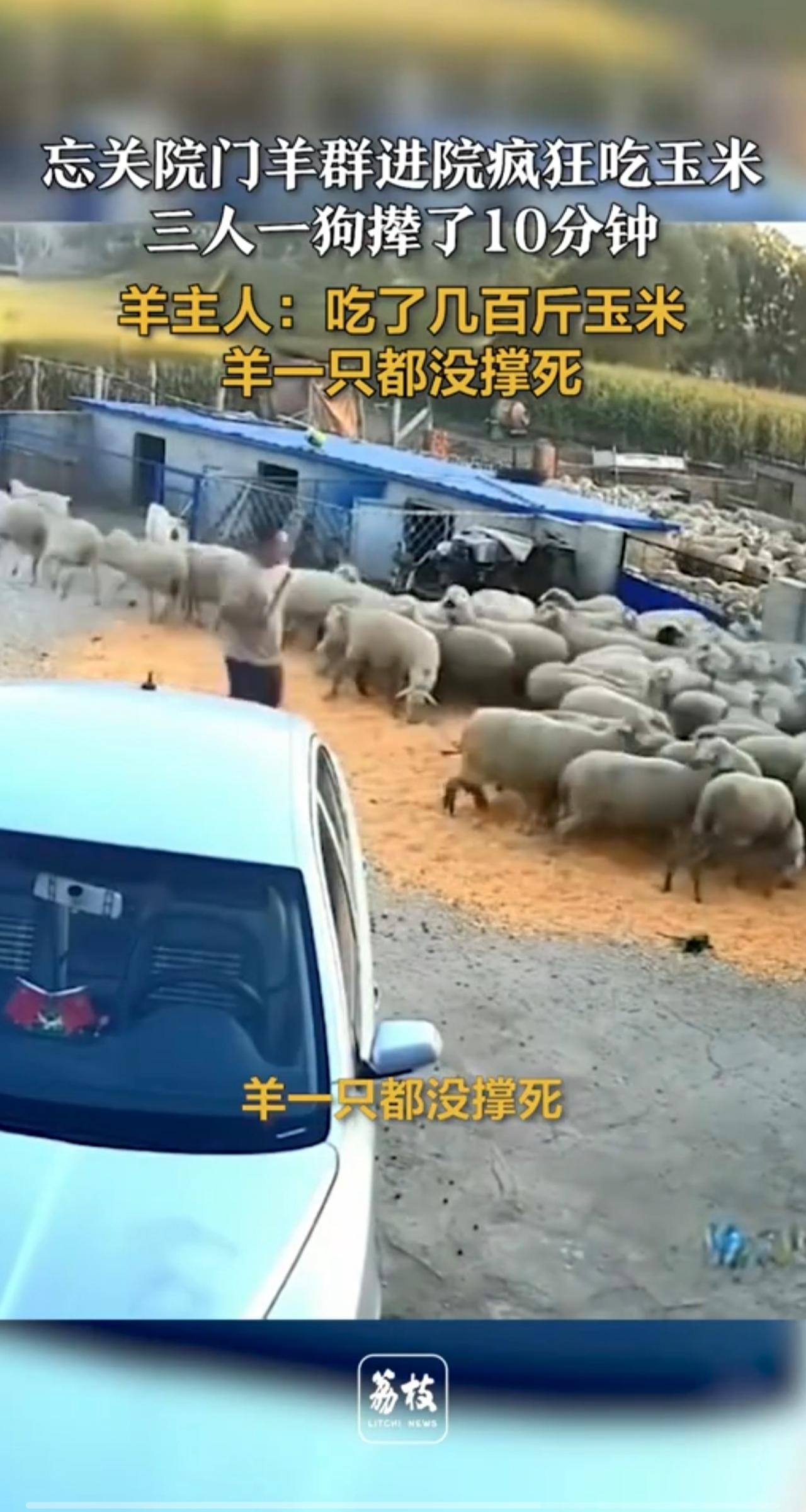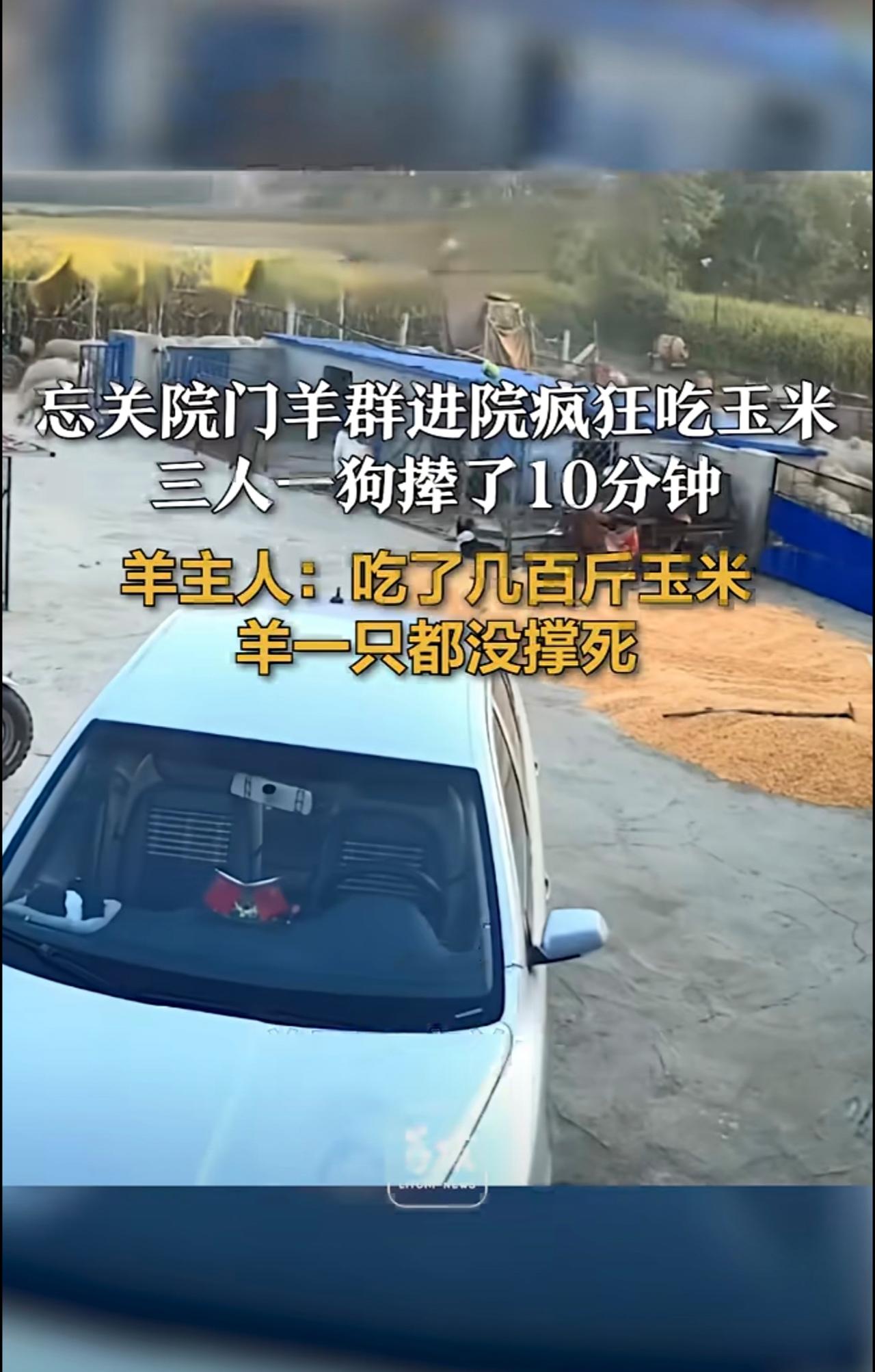 忘关院门羊群进院疯狂吃玉米 三人一狗撵了10分钟 羊主人:吃了几百斤玉米,羊一只