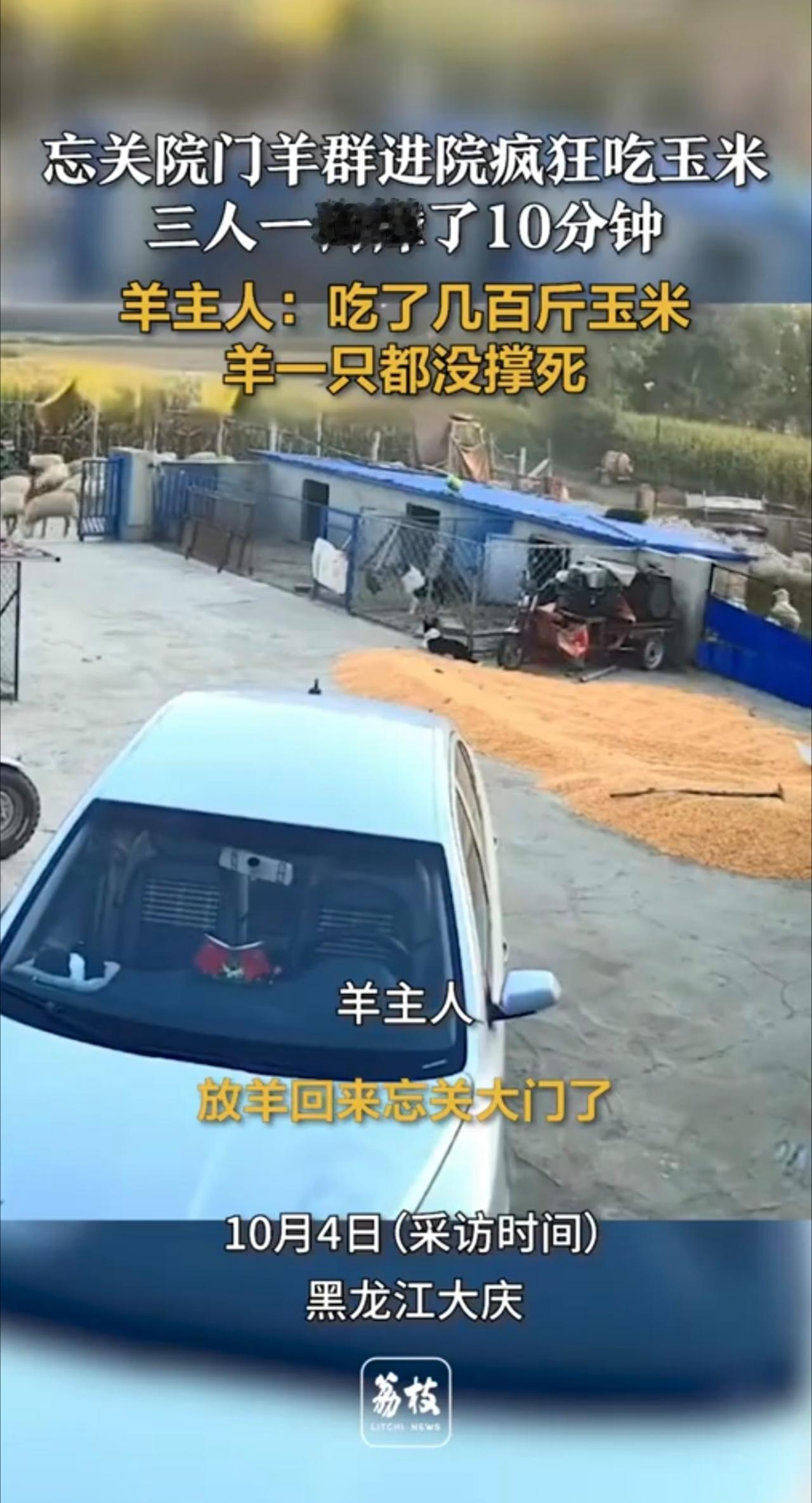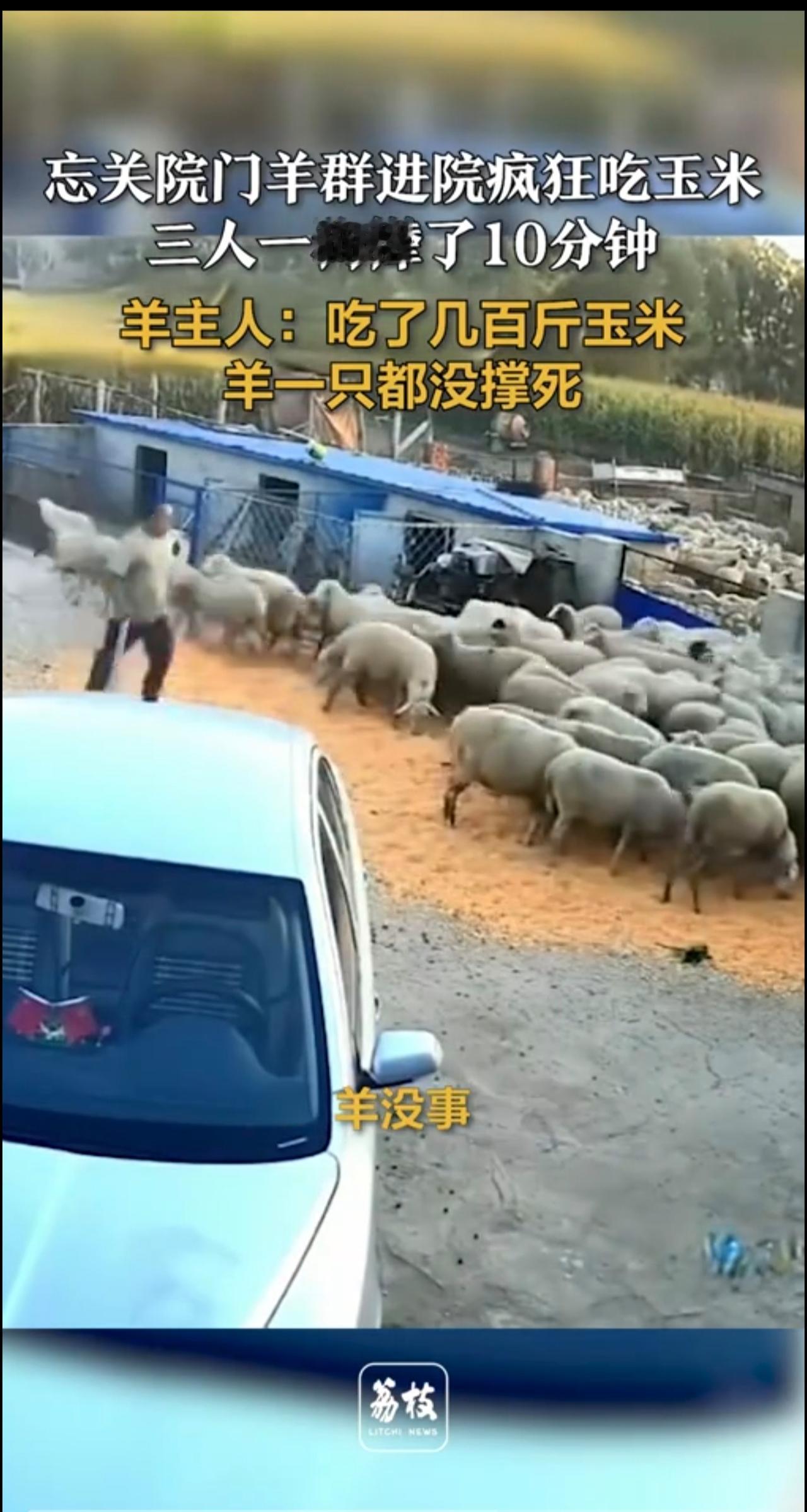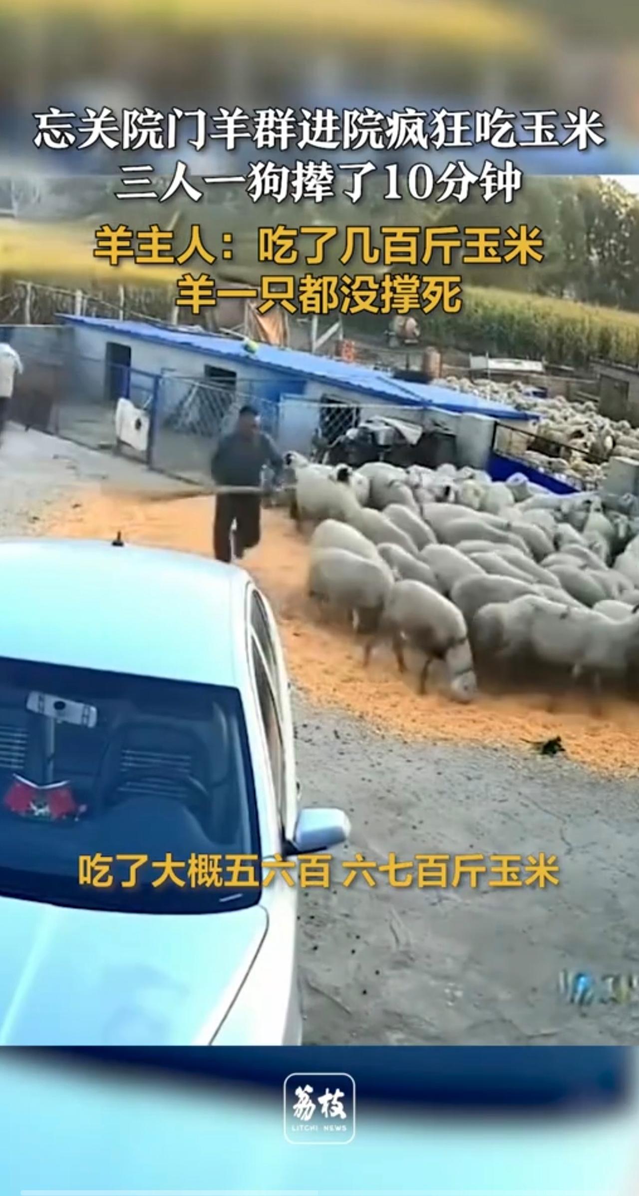 忘关院门羊群进院疯狂吃玉米 三人一狗撵了10分钟 羊主人:吃了几百斤玉米,羊一只