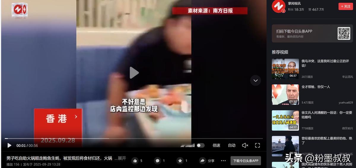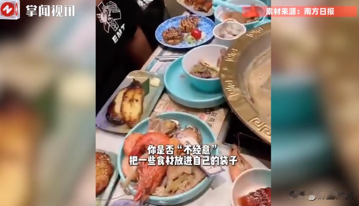 “太缺德了!”9月27日,中国香港,一男子在自助火锅店吃饭时,趁着服务员不注意,竟偷偷把鲍鱼和生蚝等等放进自己带的塑料袋里,结果后台监控发现了他的行为,服务员当场要求他把食材归还,网友:吃个自助还“又吃又拿”? 你说这自助火锅,本来就是交了钱敞开吃,想吃多少拿多少,只要不浪费没人管你,可这位倒好,不光在店里吃,还想着 “打包” 带走,而且是偷偷摸摸的,跟做贼似的。 他手里攥着个不起眼的塑料袋,藏在桌子底下,趁周围人不注意,就飞快地从餐台上夹起几只肥嘟嘟的鲍鱼,又抓了两把生蚝,往袋子里一塞,然后赶紧把袋子往自己的包旁边挪了挪,眼神还时不时瞟着服务员的方向,那鬼祟的样子,要是没被发现,指不定还得再拿点别的。 他以为自己做得天衣无缝,没人能看见,可他忘了店里天花板上还悬着监控呢!那摄像头跟个 “冷眼旁观者” 似的,把他的一举一动都拍得清清楚楚,连他往袋子里塞海鲜时手指的动作都没落下。后台盯着监控的工作人员一看这情况,赶紧跟前面的服务员说了一声。 本来以为服务员会直接冲过去,当众把他的袋子搜出来,让他下不来台,可人家店家还挺讲究,没这么做。服务员端着个盘子,假装路过他那桌,然后弯下腰,用特别温和的声音跟他说了几句。 具体说啥咱不知道,但意思肯定是让他把偷偷拿的海鲜交出来,毕竟监控拍得明明白白,店家有底气,也给了他台阶,没把事儿闹大。 那男的一开始还想装糊涂,眼神躲躲闪闪的,可架不住服务员态度虽然好,但话里没留余地,他估计也知道自己躲不过去了,脸一下子就红了,慢吞吞地从桌子底下把那个塑料袋拿出来,打开一看,里面果然装着好几只鲍鱼和生蚝,他没敢多说啥,默默地把袋子里的海鲜倒回了餐台旁边的保鲜盒里,全程头都没敢抬估计也觉得丢人。 后来这段监控录像被传到了网上,一下子就炸了锅。网友们看了都气不打一处来,评论区里全是吐槽:“吃个自助还‘又吃又拿’?这也太没素质了吧!”“交的是吃饭的钱,不是打包的钱,怎么好意思偷偷拿的?”“太缺德了!这不是欺负店家信任顾客吗?” 其实大伙儿生气,不只是因为他拿了那点鲍鱼生蚝,更因为自助餐厅的规矩本来就是 “凭自律用餐”,店家相信顾客不会浪费,也不会偷偷带走食材,才敢把那么多贵的海鲜摆在外面,让大家随便拿。 可这位倒好,把店家的信任当空气,偷偷摸摸搞小动作,这不是撕毁了双方的 “信任契约” 吗?他这么一搞,以后店家说不定就得加更多限制,比如盯着顾客拿餐,或者不让带太大的包,到时候受影响的还是其他守规矩的顾客。 更让人觉得不舒服的是,有店家说这个男的还是店里的常客。按说常来的客人,更该懂店里的规矩,也该对店家有点感情,结果他反而干出这种事儿,就更显得缺德了,合着平时来吃饭都是装的,心里早就打着 “偷偷拿点走” 的主意了? 不过还好,店家处理得挺体面,没报警,也没当众让他难堪,就是让他把东西还了回去,事儿就算过去了,可这事儿留给大家的气儿还没消,毕竟谁也不想去个自助餐厅,还得提防着有人偷偷拿东西,更不想因为少数人的缺德行为,让本来轻松的吃饭氛围变了味。 (信息来源:掌闻视讯——男子吃自助火锅顺走鲍鱼生蚝,被发现后将食材归还,火锅店回应)