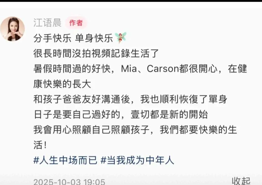女星“江语晨”官宣离婚 离婚的原因是,孩子的爸爸常年不在家,她一个人带孩子太累,也没人陪伴,但是分开后两人还是好朋友。 江语晨并发文称:“分手快乐”,“单身快乐”。看来这是憋的太久了,终于可以得到释放了!