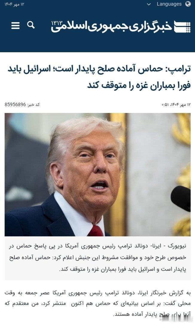 据IRNA报道,美国总统唐纳德·特朗普当地时间周五晚间表示:“根据哈马斯刚刚发布的声明,我相信他们已经准备好实现持久和平。(伊朗某通讯社)