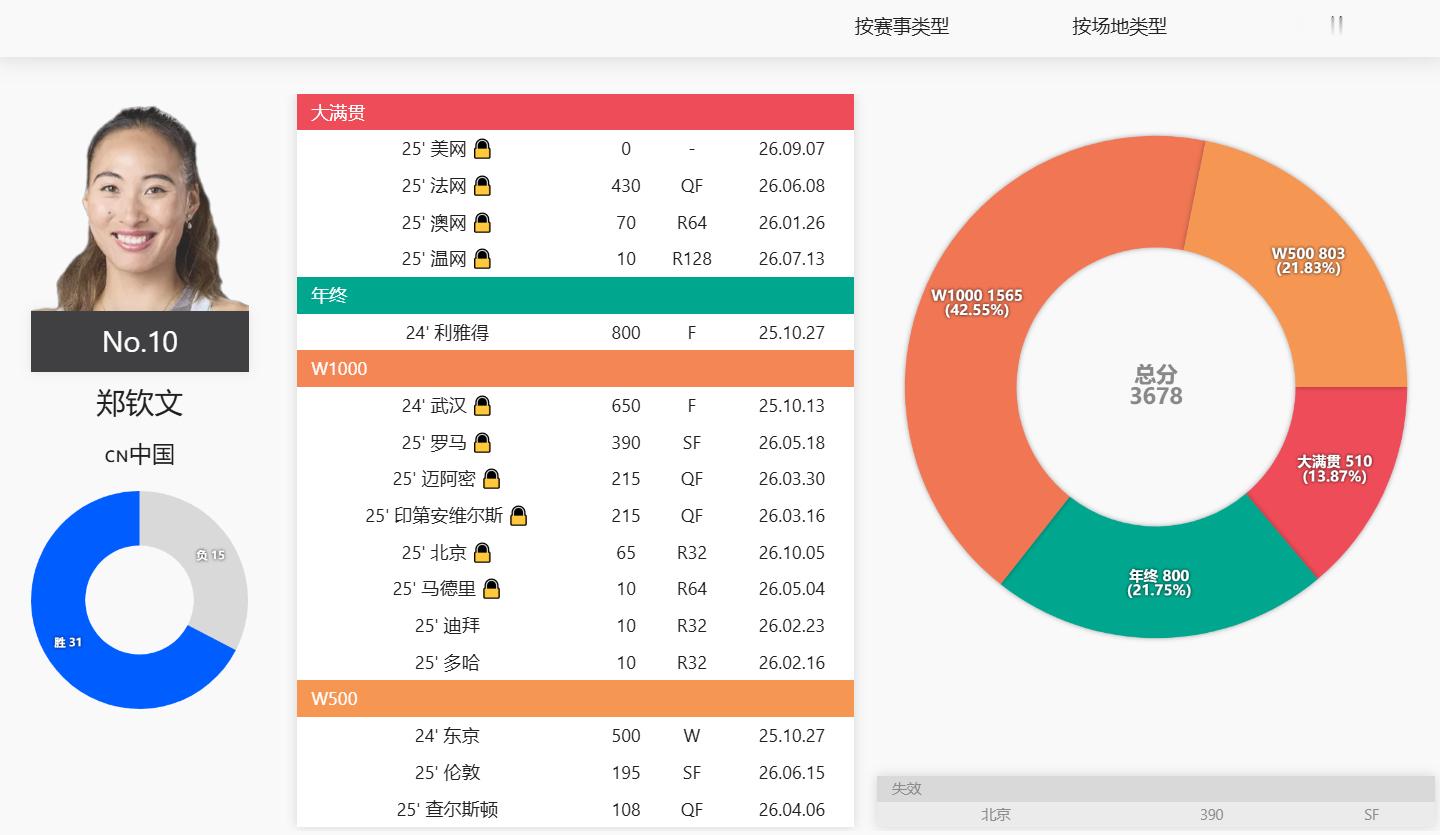去年郑钦文的亚洲赛季成绩:中网4强(390分)、武网亚军(650分)、东京站冠军(500分)、年终总决赛亚军(800分),共计2340分。