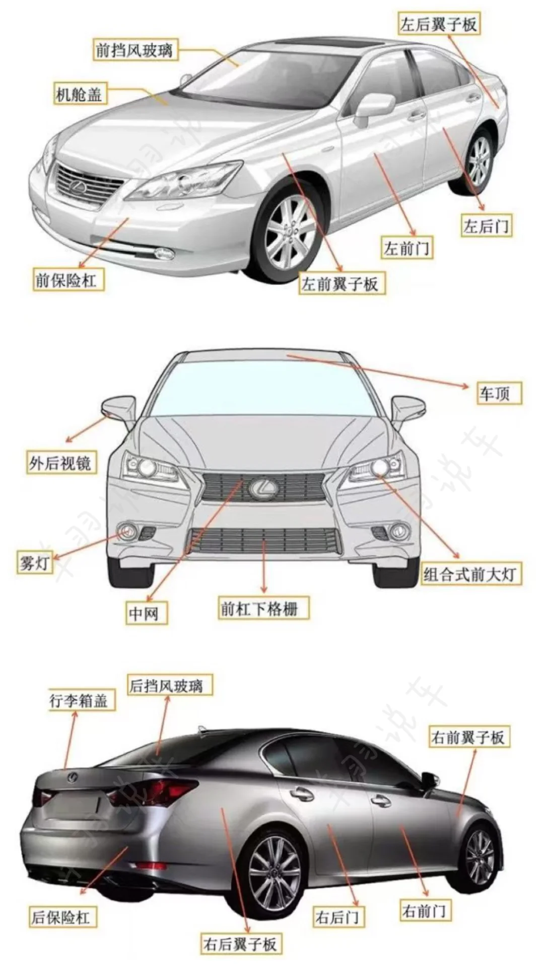*前保险杠: 保护车头,减少低速碰撞的损伤,通常集成有进气格栅和雾灯。