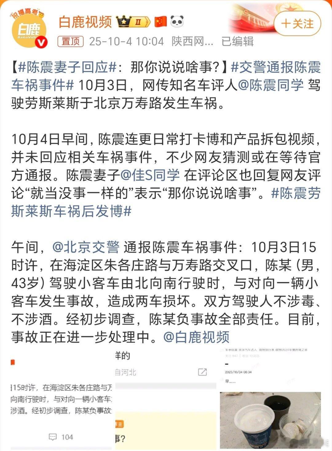 我更关心白车车主的情况。陈震妻子回应