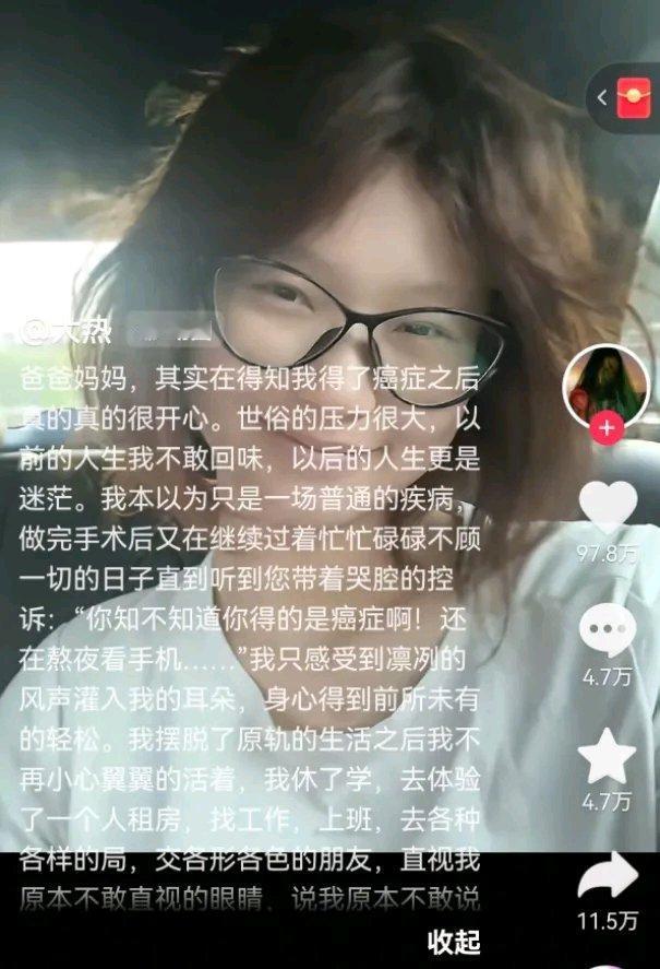 9月28日,22岁网红“大热”因结肠癌离世,让人唏嘘。她抗癌三年,生命定格在青春年华。她自述童年在严格管教和成绩压力中度过,母亲把她塑造成“优等生”,却让她缺失自由快乐,成绩下滑就会被打骂。确诊癌症后母亲才开始尊重她,可一切来得太迟。大热竟称患病“很开心”,因为能摆脱束缚,这心酸话语是对原生家庭控制型教育的反讽。 无独有偶,27岁网红小袁抗癌三年也离世。她疑因租房患急性白血病,花近百万仍复发去世。年轻生命被病魔夺走,让人痛心,也该反思生活和教育的问题。