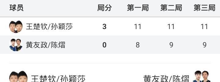 王楚欣孙颖莎3-0黄友政陈熠 混双夺冠