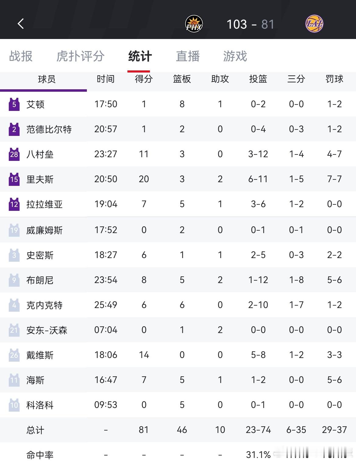 里夫斯20分,艾顿1分8板,八村垒11分,拉拉维亚7分5板太阳vs湖人