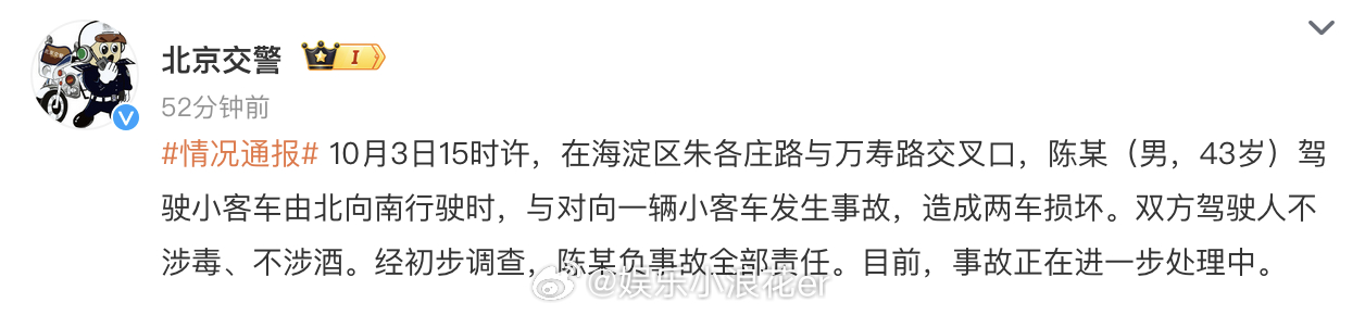 北京交警通报陈震发生车祸陈震负事故全部责任 近日,知名车评人陈震车祸消息引发热议。4日,北京交警通报:“10月3日15时许,在海淀区朱各庄路与万寿路交叉口,陈某(男,43岁)驾驶小客车由北向南行驶时,与对向一辆小客车发生事故,造成两车损坏。双方驾驶人不涉毒、不涉酒。经初步调查,陈某负事故全部责任。目前,事故正在进一步处理中。”