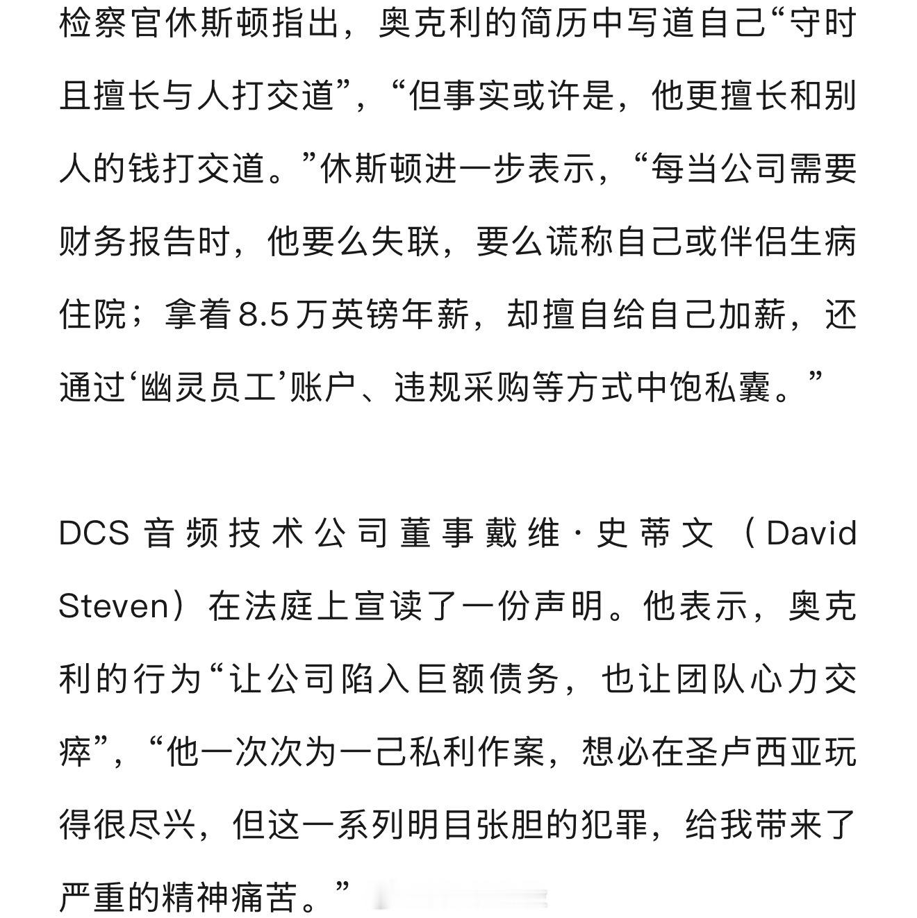 英国dCS前高管被控重罪,公司董事戴维·史蒂文(David Steven)表示其“让公司陷入巨额债务,也让团队心力交瘁”,“他一次次为一己私利作案,想必在圣卢西亚玩得很尽兴,但这一系列明目张胆的犯罪,给我带来了严重的精神痛苦。”[doge]