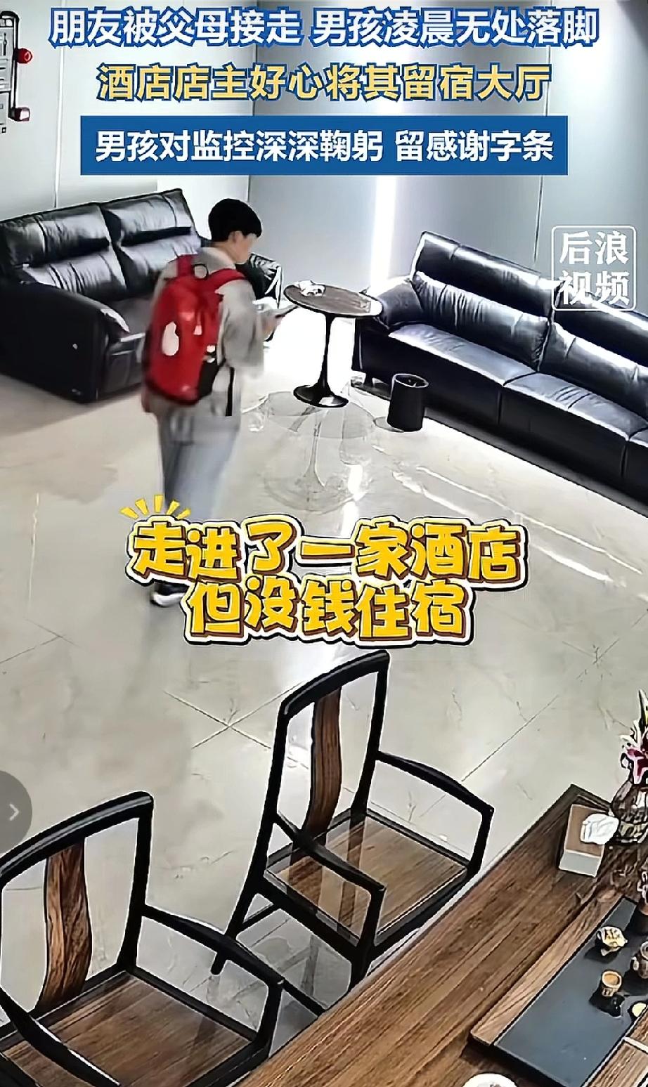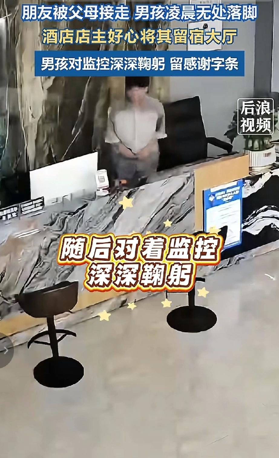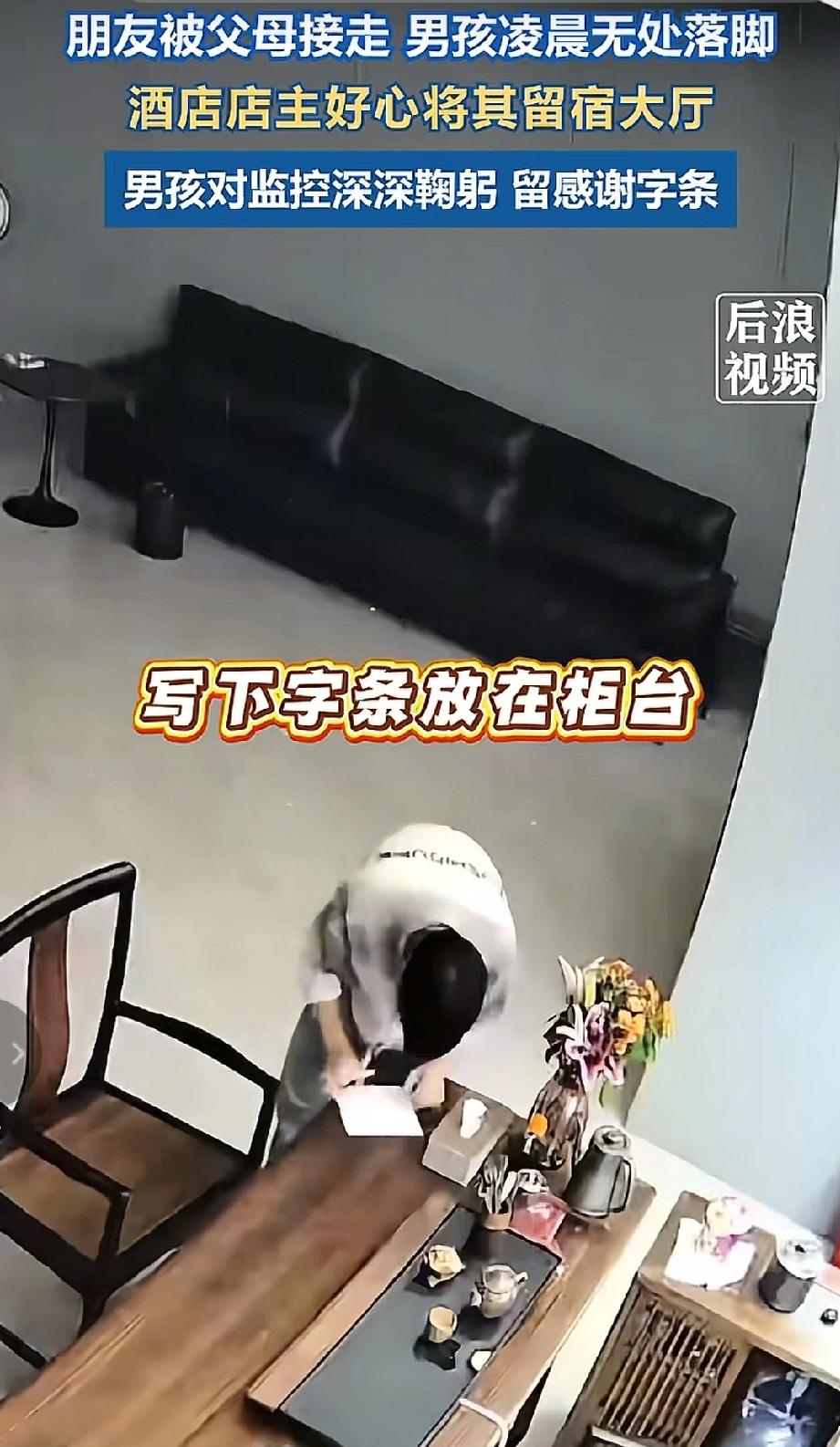 酒店里的一鞠躬让人间再现温暖。 日前,一位酒店前台服务员告诉记者,自己在酒店接待了个从怀化来火马冲找朋友的男孩。 可能朋友和我相约没告知父母,于是朋友就被父母接走了,只留下他一人在异乡的街头。凌晨两点的时候,他孤独地站在酒店门口,不知何去何从。 酒店前台说,她只是顺手留了灯,点了蚊香,然后递了风扇——因为这些都是微不足道的小事。 可她没有想到的是,第二天早上,男孩离开的时候给她留了纸条,上面写着:“谢谢姐姐收留我一晚。”还对着监控深深鞠了一躬。 那一下弯腰,是礼貌,是感恩,更是一个少年在困境中感受到善意后的真诚回应。服务员说,她看到这里时瞬间破防,鼻头一酸。 男孩朋友的父母或许有自己的考虑,但这个深夜里,孩子眼中的光,比任何理由都更动人。 善良从来都不是单向的,酒店前台服务的举手之劳,或许就是照亮别人黑夜的光。 在此小编也想对那个男孩朋友的父母说:无论你们心里有多么不痛快,但都不应该把一个外地来的孩子扔下不管不顾。你可以有怨气,但报个警,让警察叔叔来处理或者送孩子回去,至少孩子也是安全的啊,大家说是不是这个理? 酒店