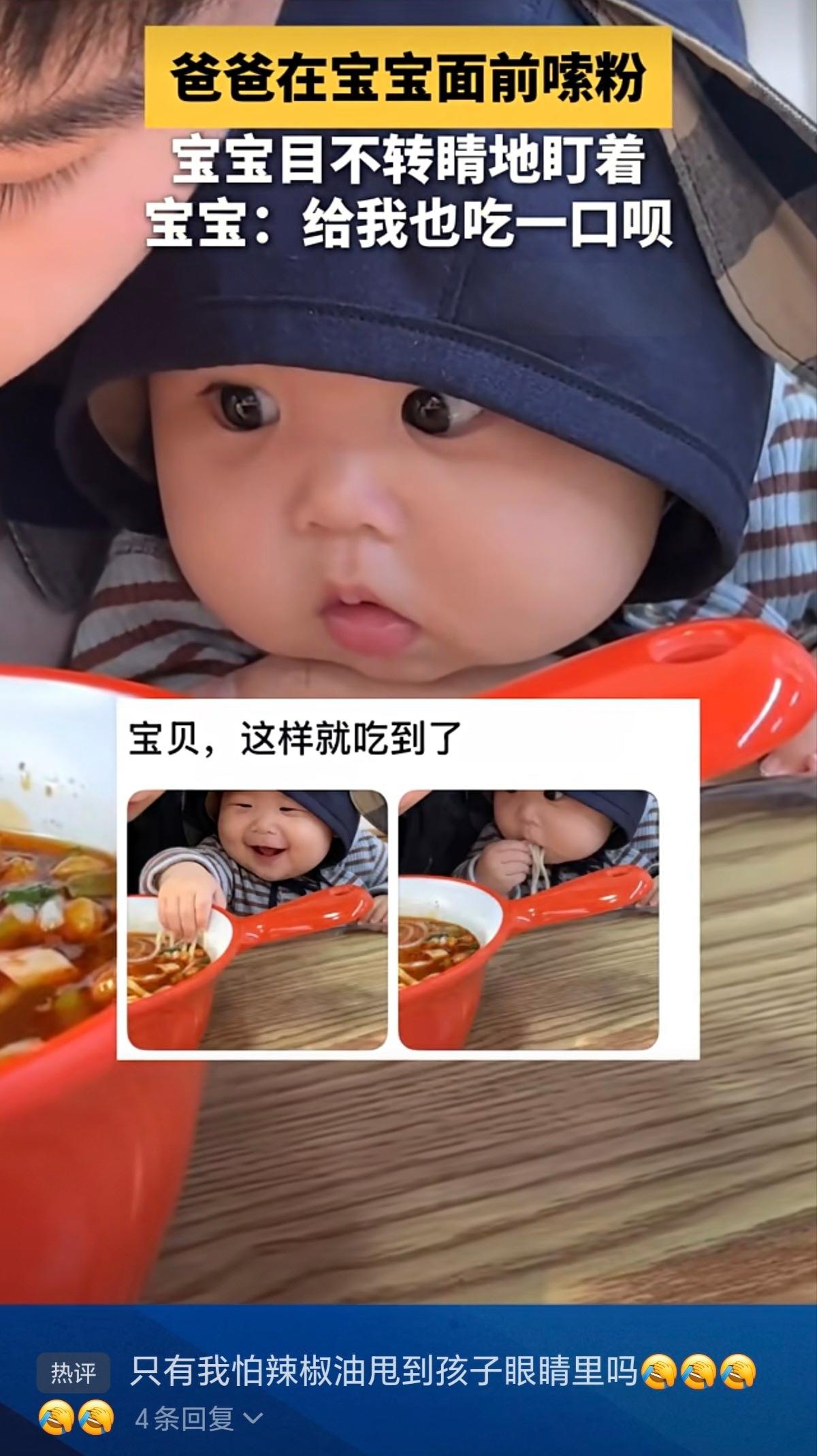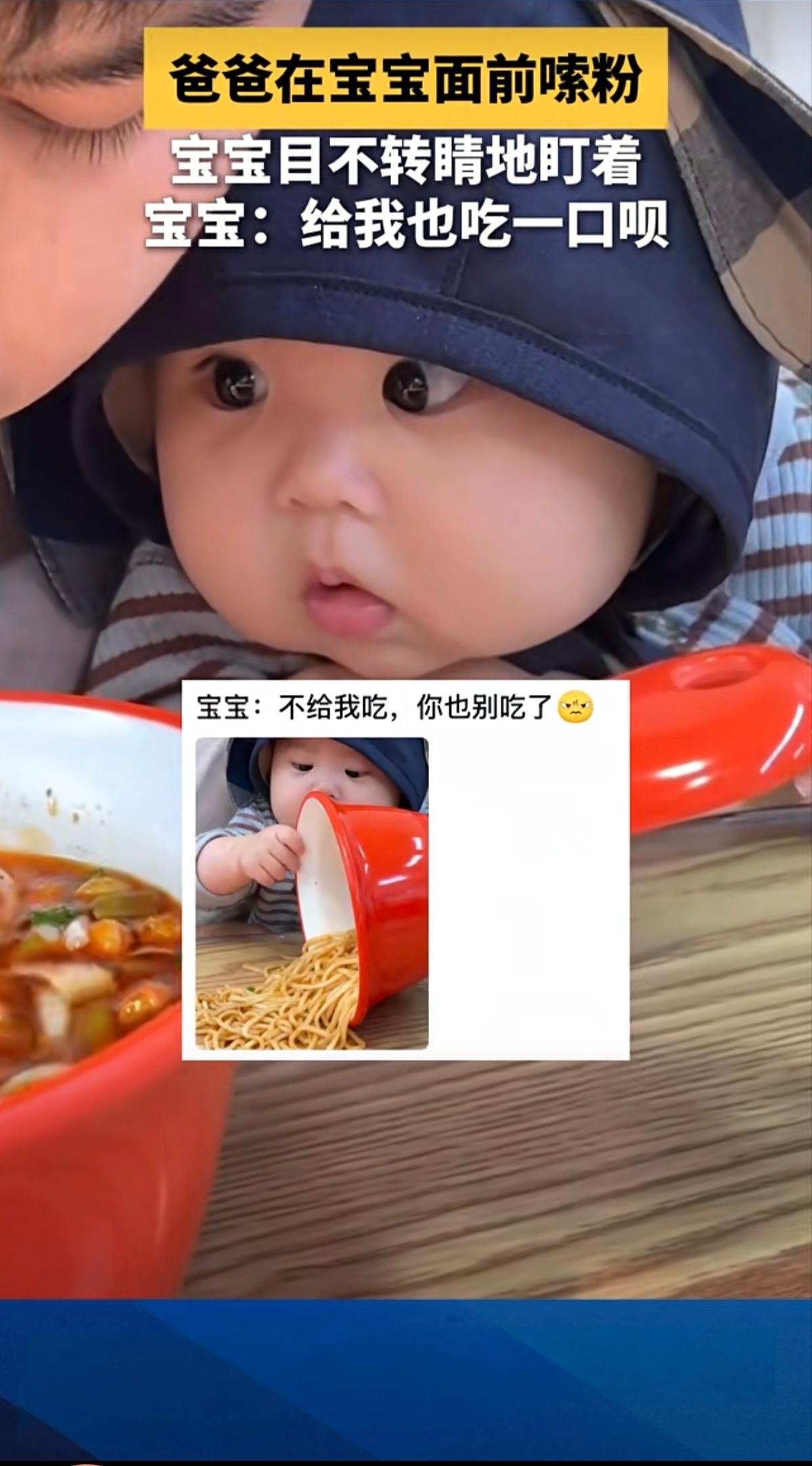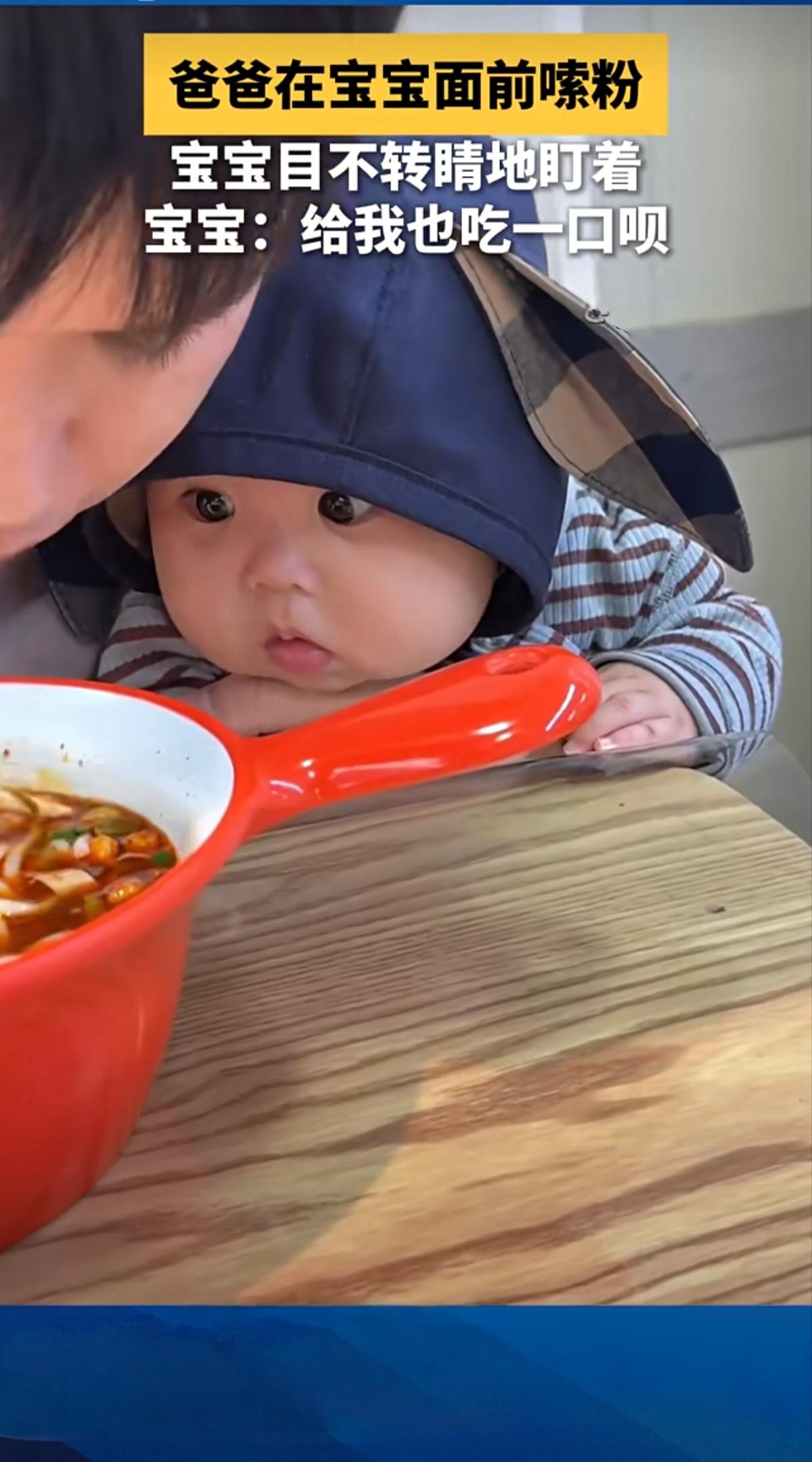 谁懂啊!爸爸吃粉被娃“盯梢”,那小眼神直冒光,比粉还香