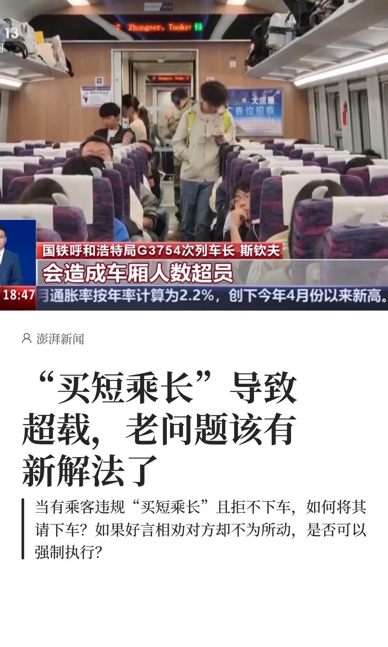 这事儿说起来真气人!9月30日那趟从杭州西开往呼和浩特东的G3754次高铁,就因为太多人“买短乘长”,结果在张家港站直接超载触发警报,硬生生停了40分钟。后面路上还接连出了两次同样的情况,整趟车晚点一个多小时。 “买短乘长”这毛病真是老生常谈了。每年春节、五一、十一这些出行高峰,准要出几回这样的事。说白了,就是有些人买短途票上车,到站了赖着不下,想蹭到更远的地方。平时人少的时候可能还能睁只眼闭只眼,可一到节假日大家都赶时间,你这么一搞,整列车的时间表全乱套了。 要我说,这种钻空子的行为真不能惯着。一个人这么干,可能觉得没啥,但要是人人都这么想,列车还怎么正常运行?最后倒霉的是所有乘客——想下的下不去,想上的上不来,好好的出行计划全被打乱。 铁路部门也该想想办法了。光靠列车员一个个查票、劝下车,效率太低。能不能在售票环节就设置限制?或者对恶意“买短乘长”的列入失信名单?老问题总得有个新解决办法。 大家都是赶路的,互相体谅一下。规矩定了就是让大家遵守的,不能因为自己想方便就坏了规矩,最后让一车人陪你耽误时间。你们说是不是?
