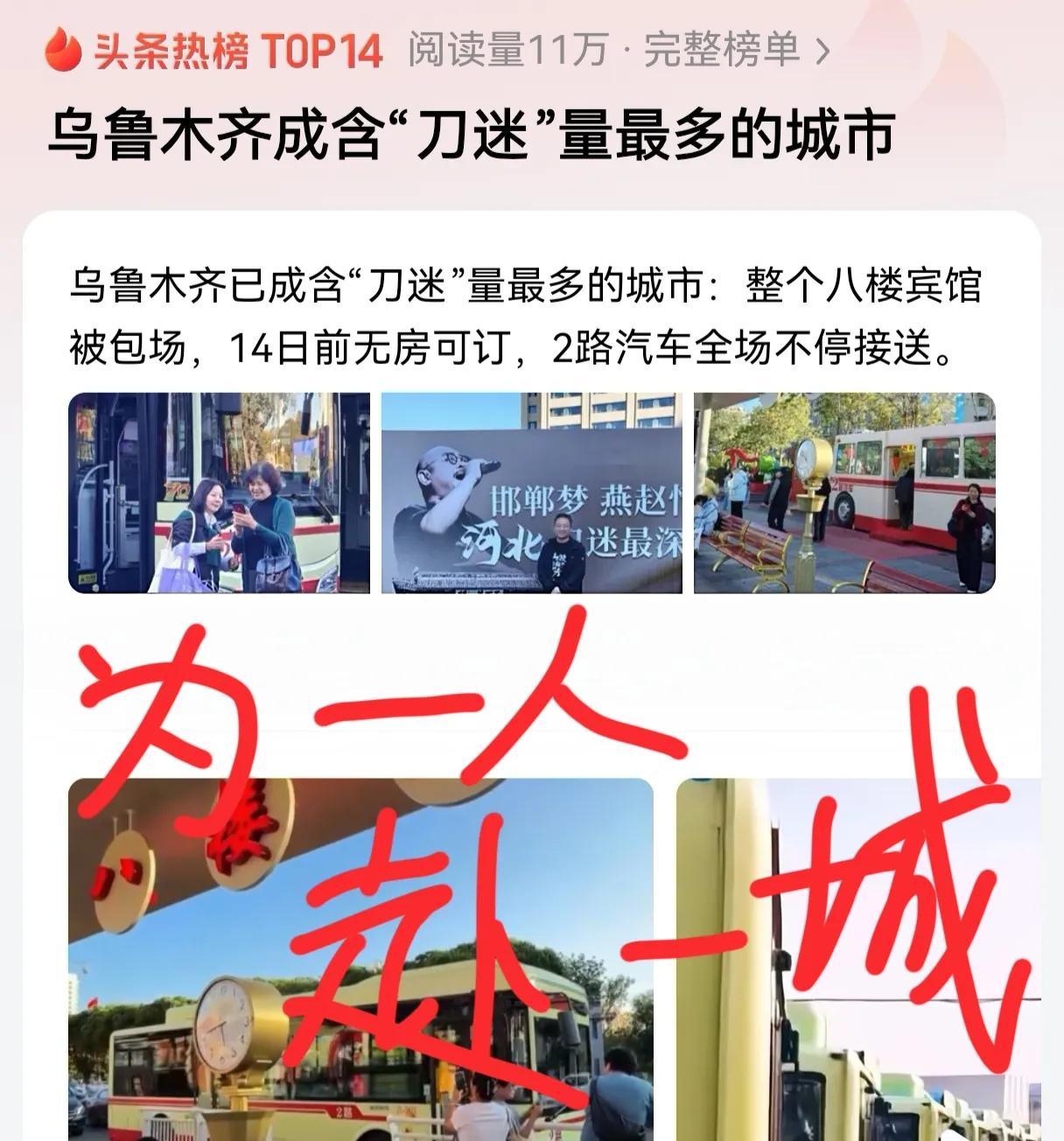 为一人,赴一城!乌鲁木齐成刀迷量最多的城市! 又是刀郎封神的一战,各路刀迷齐汇聚,2路汽车停不下来了,西海情歌唱响飘着孜然味的街头巷尾! 唯刀郎,能让五湖四海的人跨越山海奔赴而来!